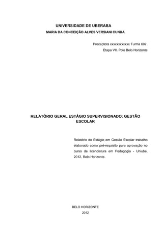 1. O documento é um relatório de estágio em gestão escolar realizado na Escola Municipal “Cláudio Pinheiro de Lima”.