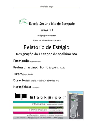 O relatório descreve o estágio de Bernardo Pinto na Blackpixel lda. Ele realizou várias tarefas como formatações, instalações de software, reparações de computadores e portáteis, e aprendeu sobre programação HTML, CSS e Java. O estágio durou de 28 de Janeiro a 26 de Abril de 2013 e ajudou no desenvolvimento técnico e pessoal de Bernardo.