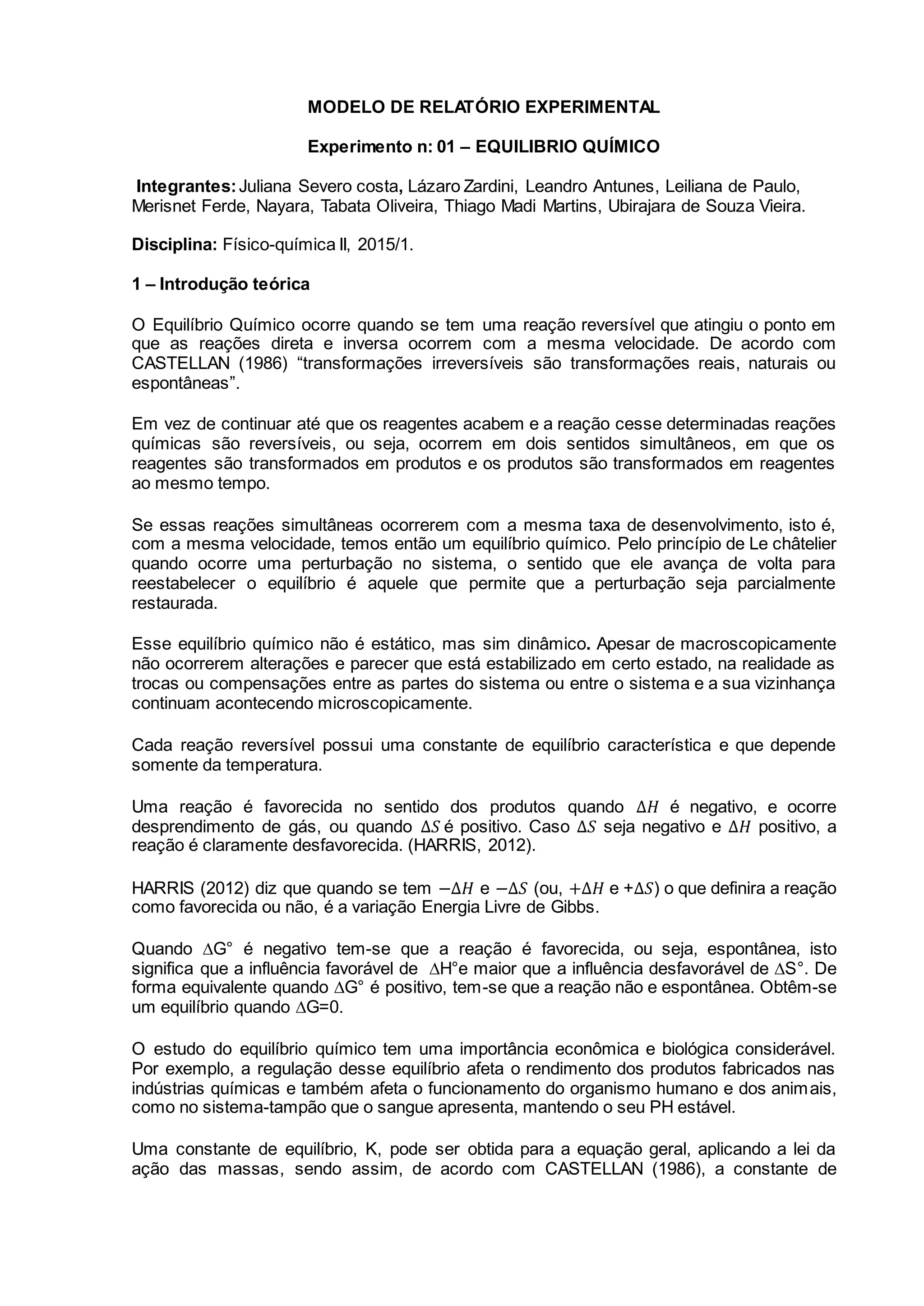 [1] O documento apresenta um relatório experimental sobre o equilíbrio químico da reação de esterificação entre ácido acético e etanol. [2] Foram realizadas titulações de soluções em equilíbrio para calcular as concentrações dos reagentes e produtos e determinar a constante de equilíbrio K. [3] O valor obtido para K foi de 1,94, indicando que a reação ocorreu no sentido de formação do produto acetato de etila.