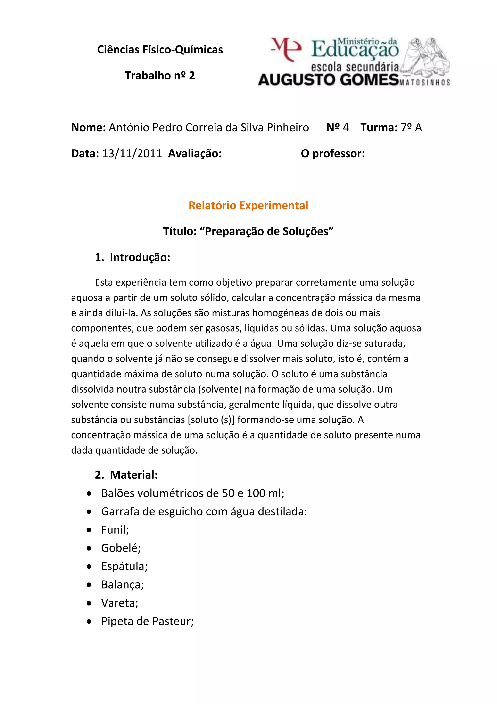 Este relatório descreve um experimento para preparar soluções de sulfato de cobre (II) em água. O estudante pesou o soluto, dissolveu-o em água, transferiu a solução para balões volumétricos e calculou as concentrações massicas. As concentrações diminuíram quando mais água foi adicionada, ilustrando o conceito de diluição, e aumentaram com mais soluto, ilustrando saturação. O relatório conclui que uma solução é uma mistura homogênea.