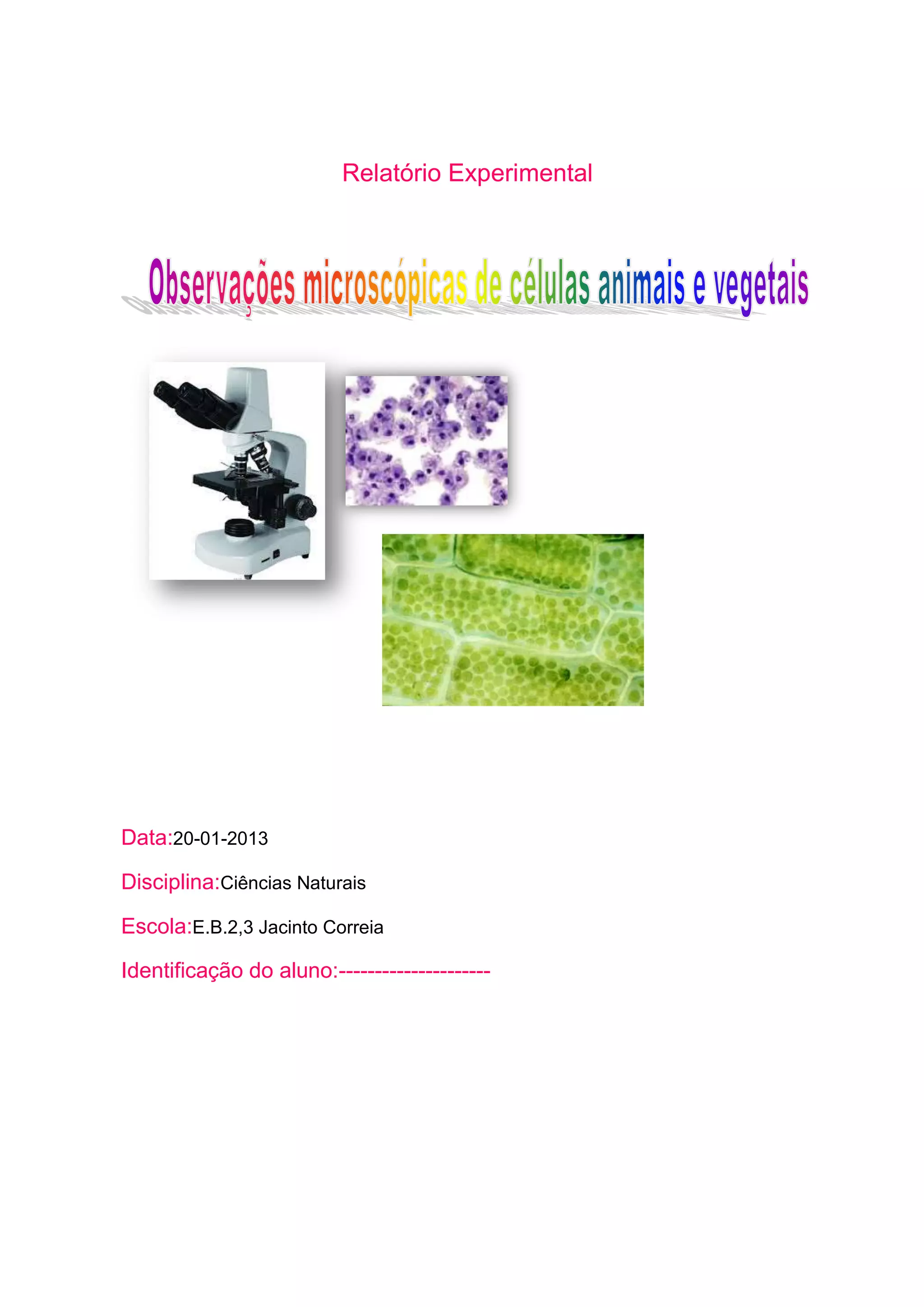 Este relatório descreve três experimentos realizados para observar células animais e vegetais ao microscópio. Nas primeiras experiências, células da boca e da cebola foram analisadas usando corantes para identificar estruturas como a membrana e o núcleo. A terceira experiência observou estomas e cloroplastos em células vegetais. Os objetivos eram distinguir células animais de vegetais e aprender a usar o microscópio.