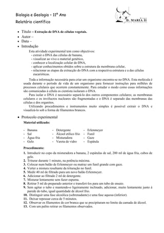 Este relatório descreve um experimento para extrair DNA de células de banana. O DNA é isolado através da trituração da banana, filtração, uso de detergente para romper membranas celulares, e precipitação do DNA com álcool. Após o processo, filamentos brancos de DNA são visíveis na interface entre as fases aquosa e alcoólica.