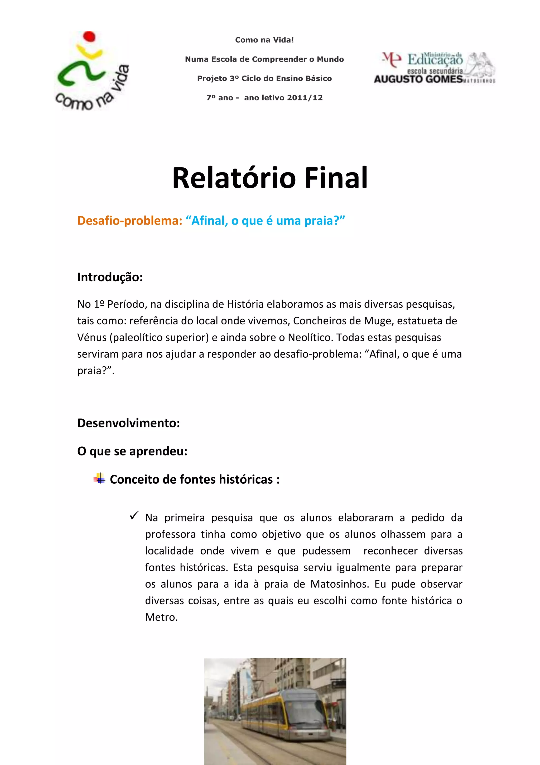 O documento resume as conclusões de uma pesquisa realizada por alunos do 7o ano sobre o significado de uma praia. Eles aprenderam que uma praia fornece muitas fontes históricas e acompanhou a evolução humana, servindo como meio de subsistência na pré-história e atualmente proporcionando lazer. A praia assistiu à evolução do homem de caçador-coletor para uma vida sedentária e é agora um local de lazer, pesca e comunicação entre países.