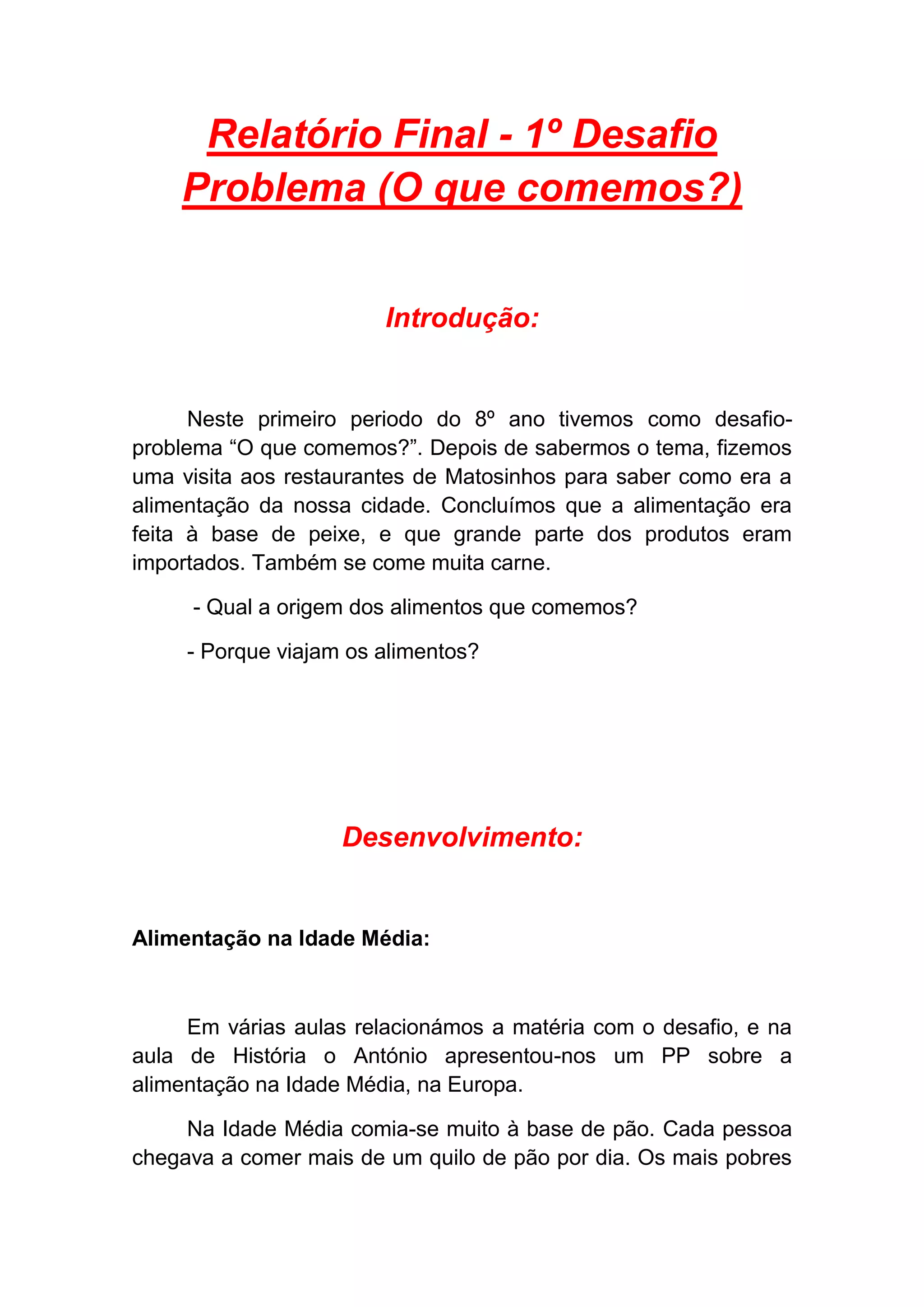 Este relatório final resume um projeto sobre a origem dos alimentos. Os estudantes visitaram restaurantes locais e aprenderam que a dieta era baseada em peixe e produtos importados. Eles também exploraram como a dieta medieval era principalmente de pão, carne e peixe. Os descobrimentos portugueses trouxeram novos alimentos da África, Ásia e Américas, diversificando a dieta portuguesa.