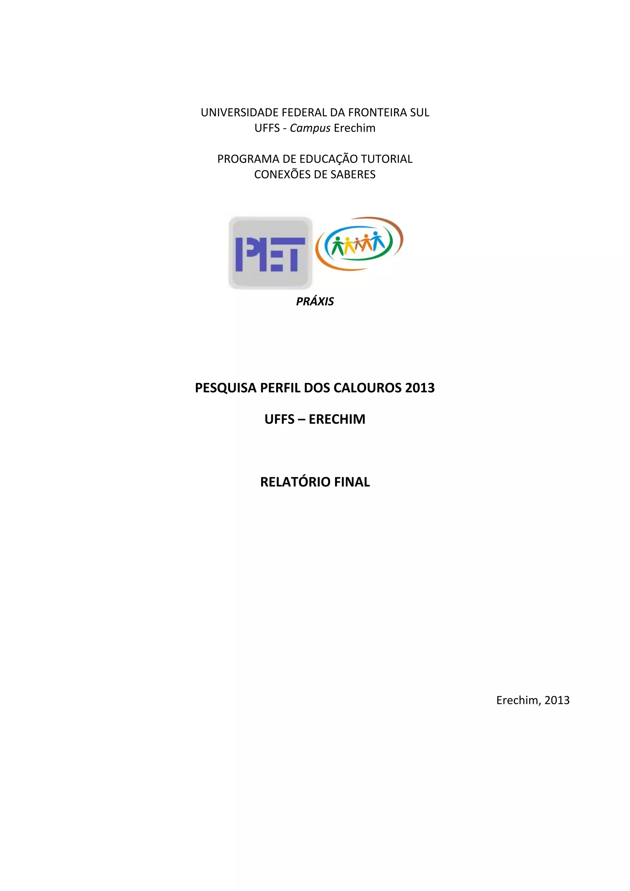 O relatório apresenta os resultados da pesquisa sobre o perfil dos calouros da UFFS/Erechim em 2013. Foram aplicados questionários com 289 estudantes ingressantes nos cursos de graduação. A maioria dos calouros tem até 20 anos, vem de cidades próximas a Erechim e estudou em escola pública. O relatório fornece informações sobre gênero, raça, local de moradia e outros dados dos novos alunos da universidade.