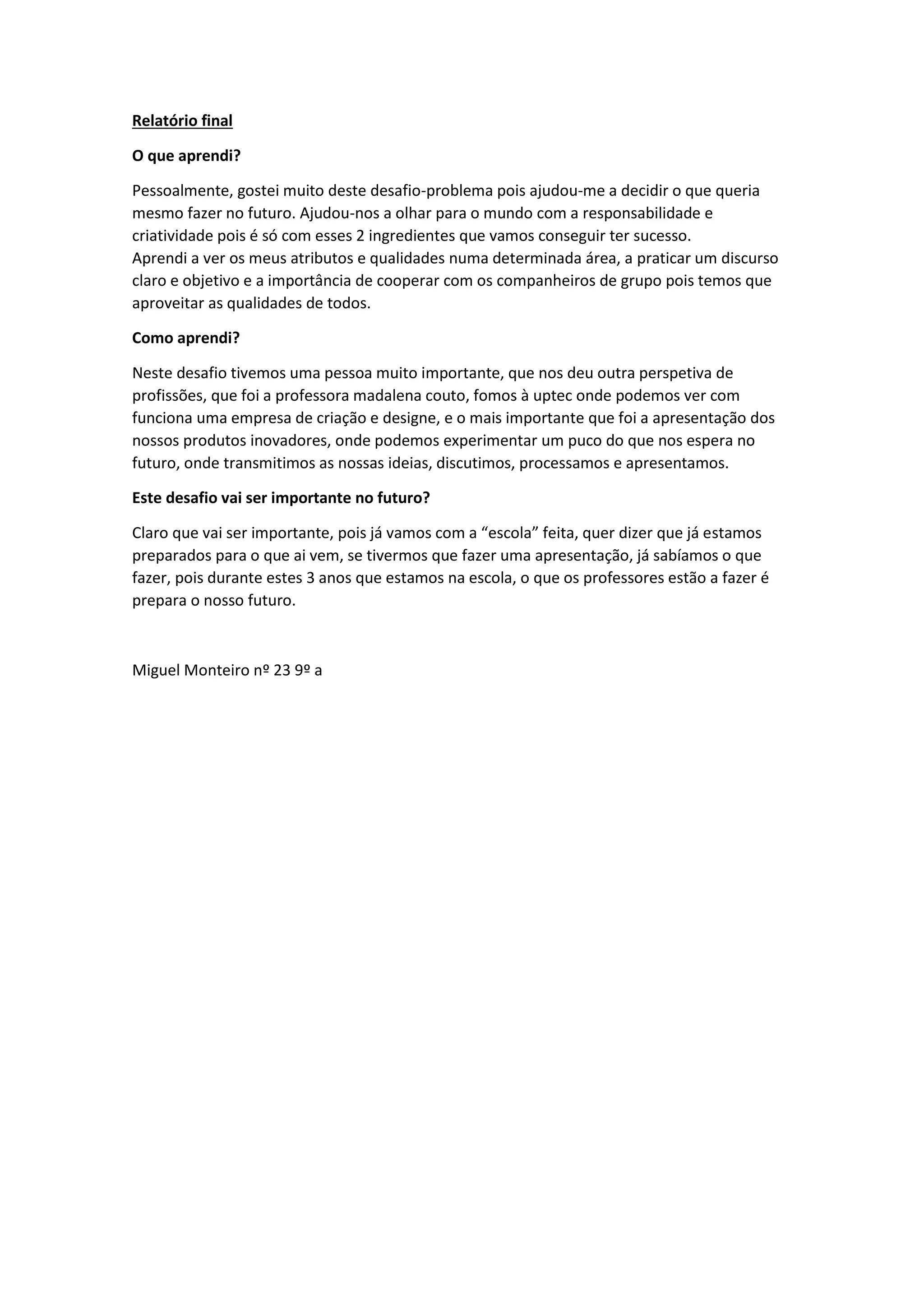 O relatório final do aluno descreve como o desafio-problema o ajudou a decidir sua futura carreira e desenvolver responsabilidade e criatividade. Ele aprendeu a avaliar suas próprias habilidades, a importância da cooperação em grupo, e como uma apresentação pública pode prepará-lo para o futuro.