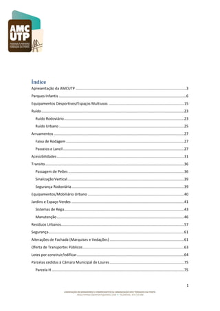 O documento aborda a atuação da associação de moradores da urbanização dos Terraços da Ponte, destacando a colaboração com autoridades locais e diversas iniciativas realizadas para melhorar a infraestrutura e qualidade de vida da área. Problemas relacionados a equipamentos desportivos, parques infantis e questões de ruído são discutidos, evidenciando a falta de conformidade com regulamentações e a necessidade de intervenções. Além disso, são mencionados desafios no trânsito, acessibilidade e segurança rodoviária, com chamadas à ação para resolver as deficiências estruturais e de serviços públicos.