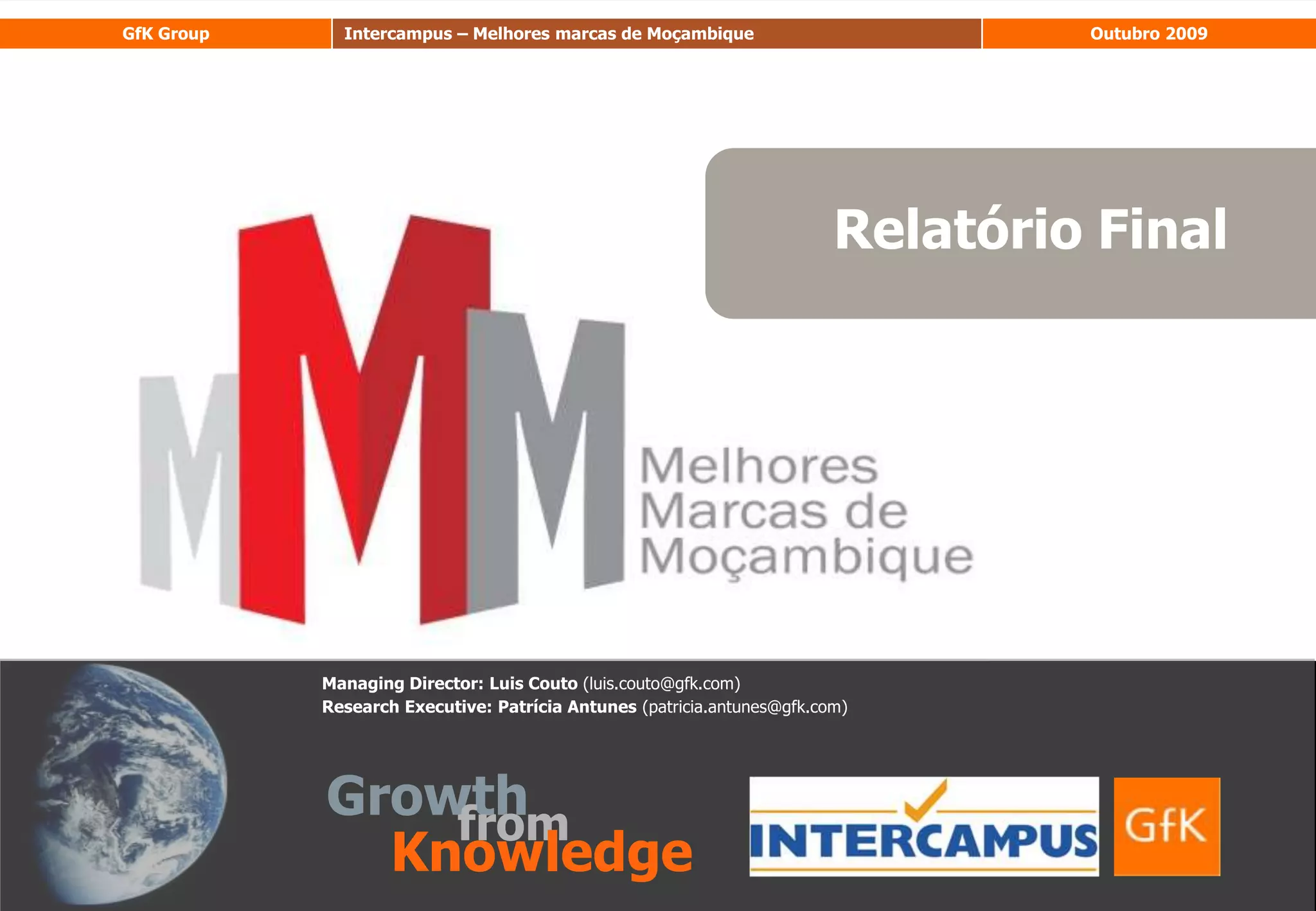 Este relatório apresenta os resultados de um estudo de mercado realizado pela Growth from Knowledge para identificar as melhores marcas em Moçambique. O estudo utilizou metodologias qualitativas e quantitativas, incluindo entrevistas com especialistas e mais de 13 mil entrevistas presenciais. As melhores marcas foram identificadas em oito setores, calculando um índice de atratividade de marca. As oito marcas mais atrativas em cada setor foram avaliadas em mais detalhe.