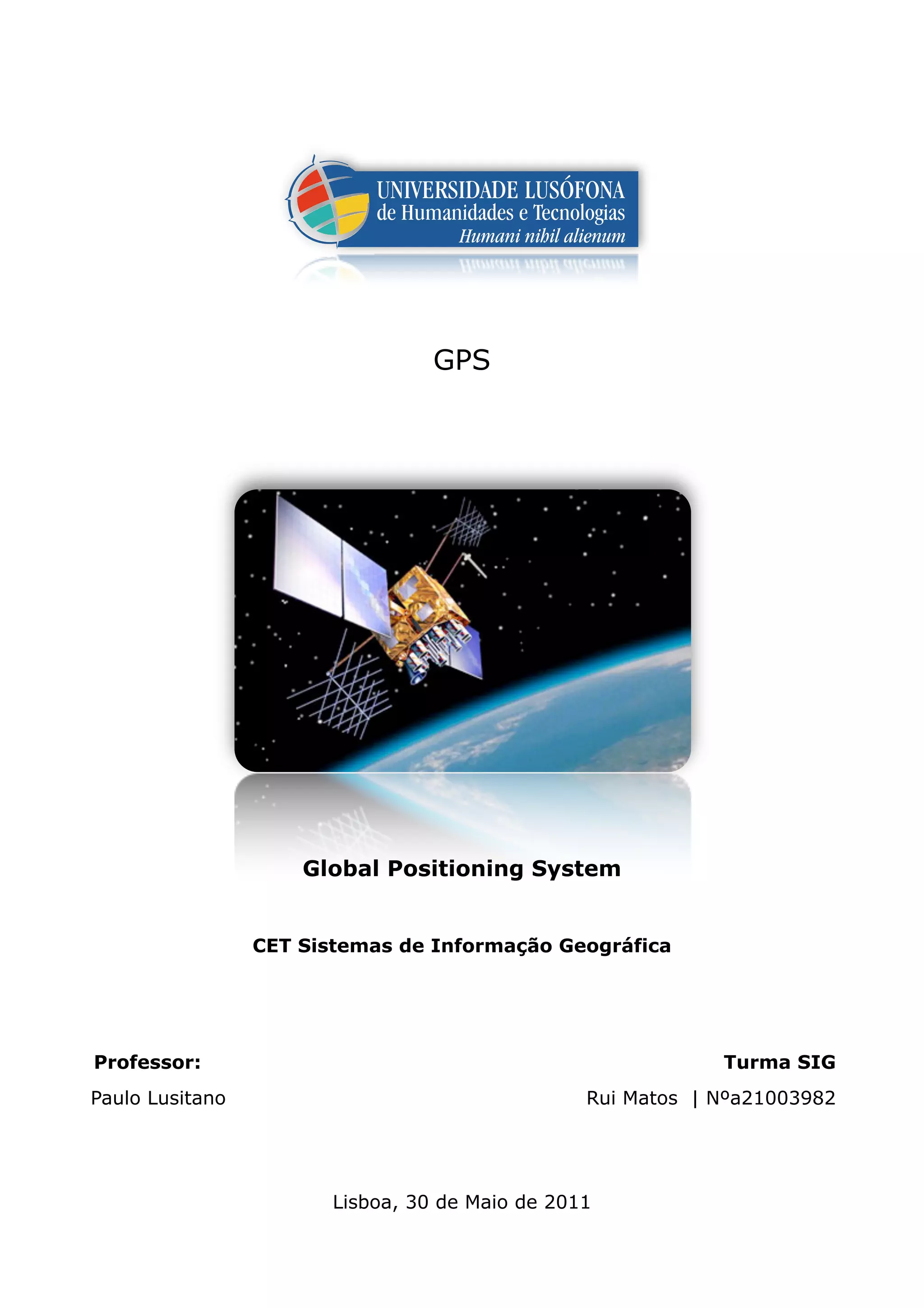 Este documento discute o Sistema Global de Posicionamento (GPS) em detalhe. Detalha os componentes do sistema GPS, como os satélites, receptores e sinais. Também explica como o posicionamento é calculado através da trilateração e os fatores que afetam a precisão, como a posição dos satélites. Por fim, apresenta um caso de estudo português sobre o monitoramento da costa terrestre usando GPS.