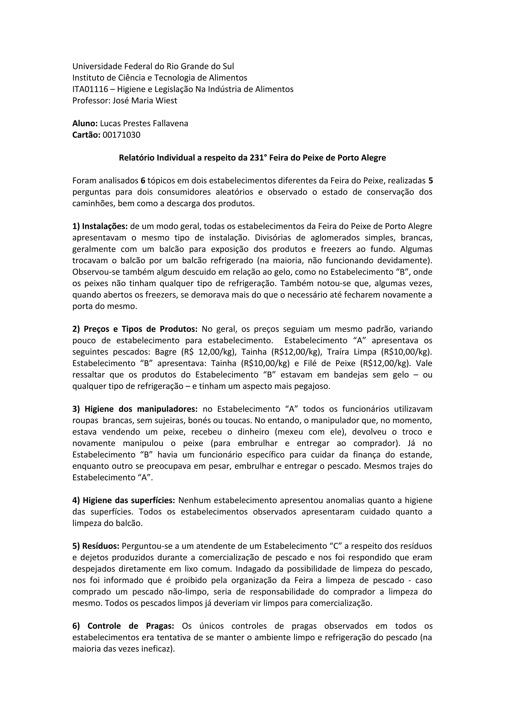 1) Os estabelecimentos da Feira do Peixe de Porto Alegre apresentavam instalações similares com divisórias simples e freezers, porém alguns produtos careciam de refrigeração adequada.