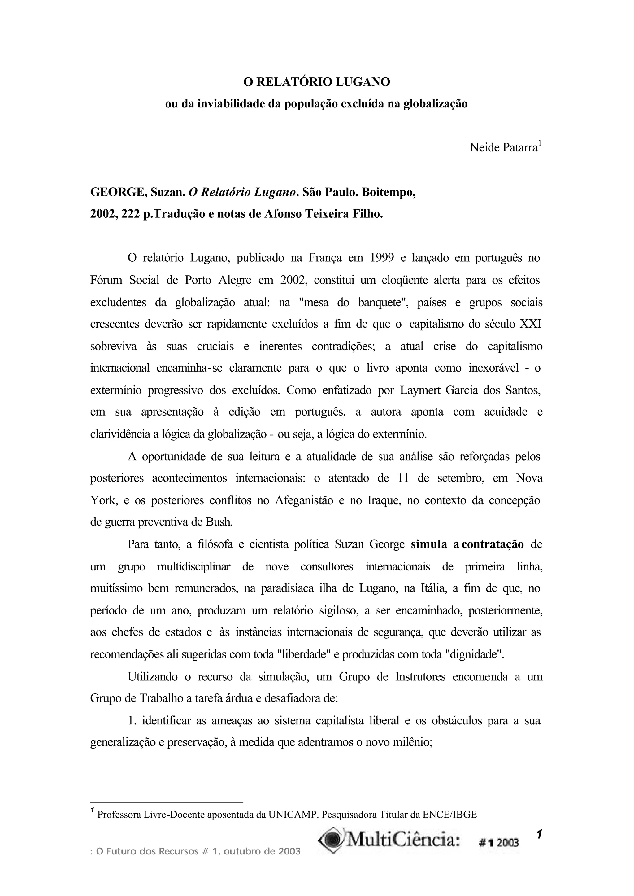 1) O relatório analisa os efeitos excludentes da globalização atual e argumenta que a população mundial crescente é incompatível com o sistema capitalista;
