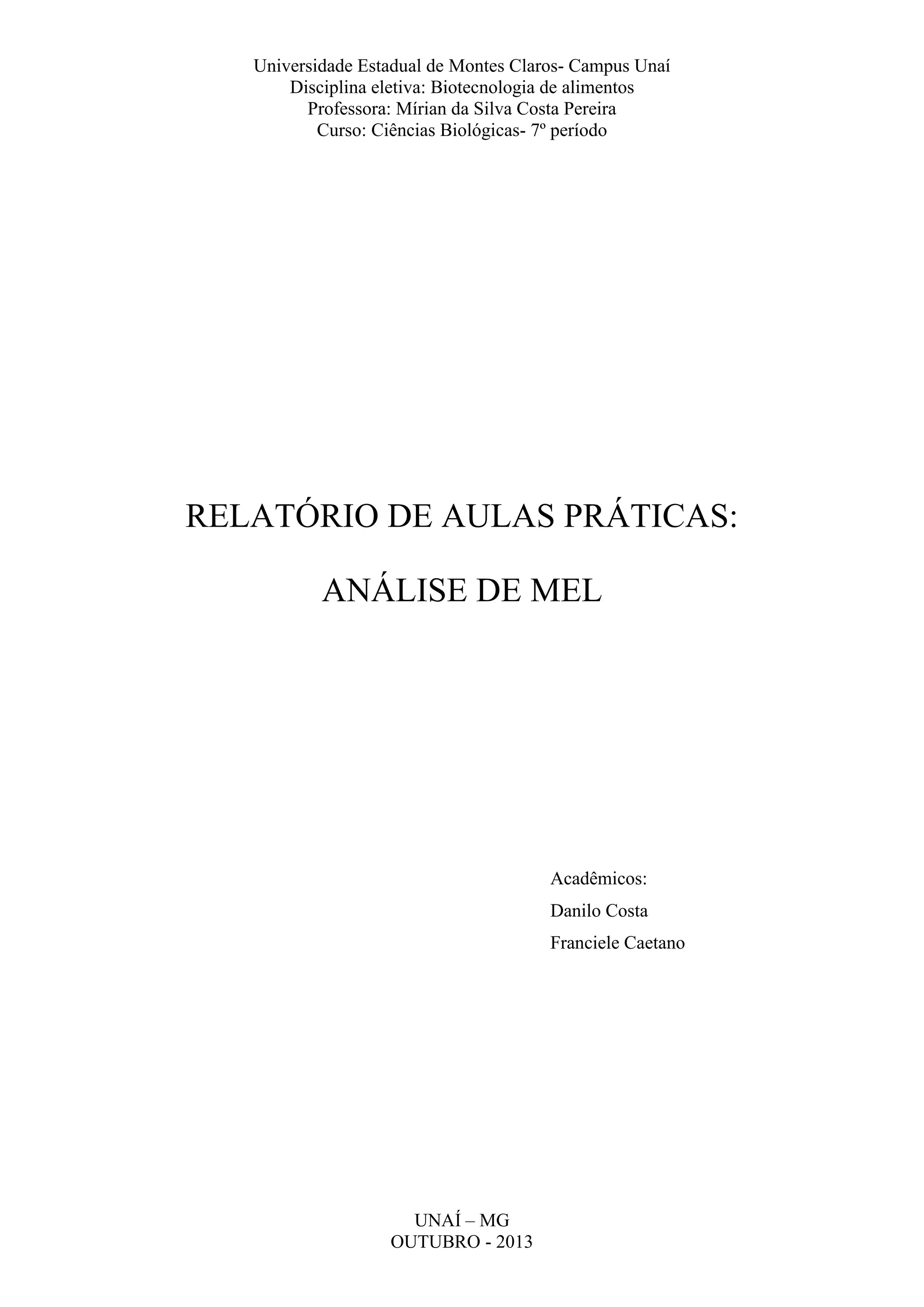 O documento descreve um relatório de aulas práticas sobre análise de mel e um alimento à base de glicose. Foram realizados testes de densidade, acidez, reação cromática, enzimas diastásicas e corantes nas amostras. Os resultados indicaram que o mel apresentou maior densidade e acidez em comparação com o alimento, mas ambos não apresentaram adulteração com açúcares ou corantes.
