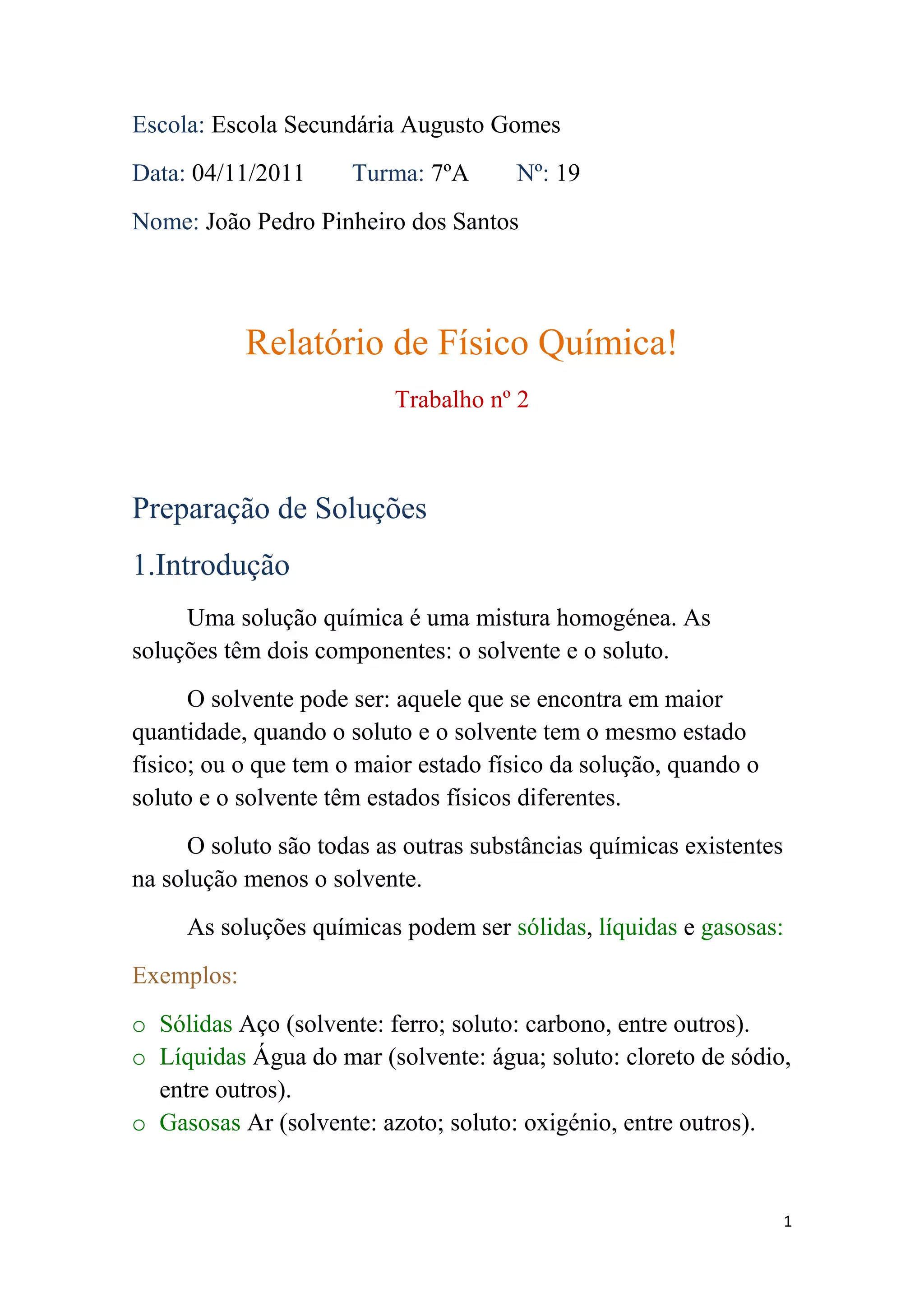 Este relatório descreve um experimento sobre preparação de soluções. Nele, o aluno dissolve sulfato de cobre em água para criar duas soluções aquosas de diferentes concentrações e aprende sobre os componentes e tipos de soluções, além de como medir a concentração de soluções.