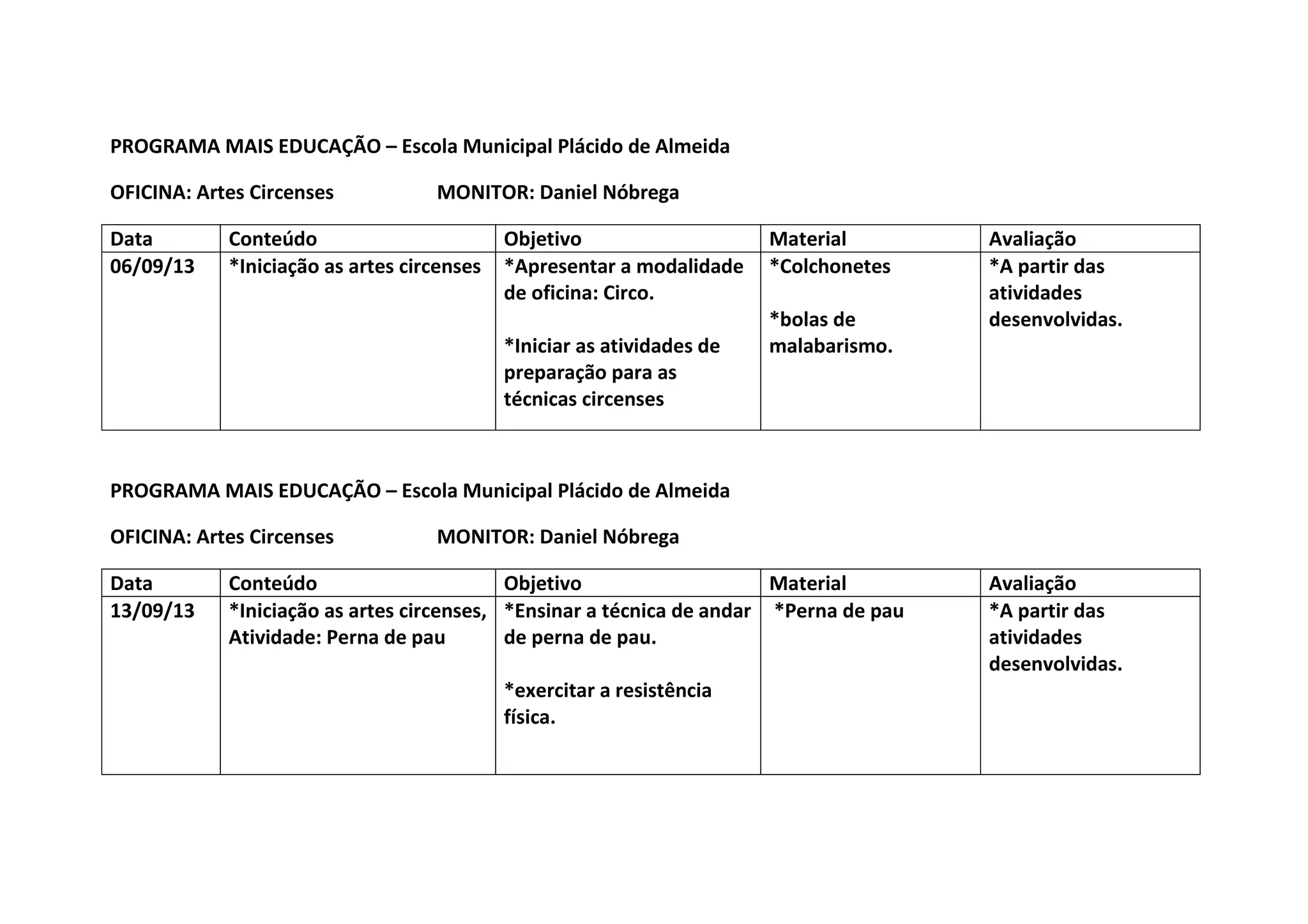 O documento descreve três aulas de uma oficina de artes circenses em uma escola municipal. A primeira aula apresentou as atividades circenses gerais. A segunda aula ensinou a técnica de perna de pau e enfatizou a importância do bom comportamento. A terceira aula continuou a praticar perna de pau e mostrou um vídeo de circo para estimular o interesse dos alunos.