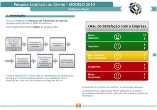 Este relatório apresenta os resultados da pesquisa de satisfação do cliente realizada pela Carvalho e Mello Consultoria. As principais seções incluem: 1) Introdução sobre as etapas da pesquisa; 2) Aplicação do questionário; 3) Análise da lealdade do cliente; 4) Identificação de atributos chave para fidelização; 5) Perfil dos respondentes; 6) Mapeamento da árvore de valor percebida pelo cliente; 7) Análise da importância dos atributos; 8) Medição da favorabilidade dos clientes.