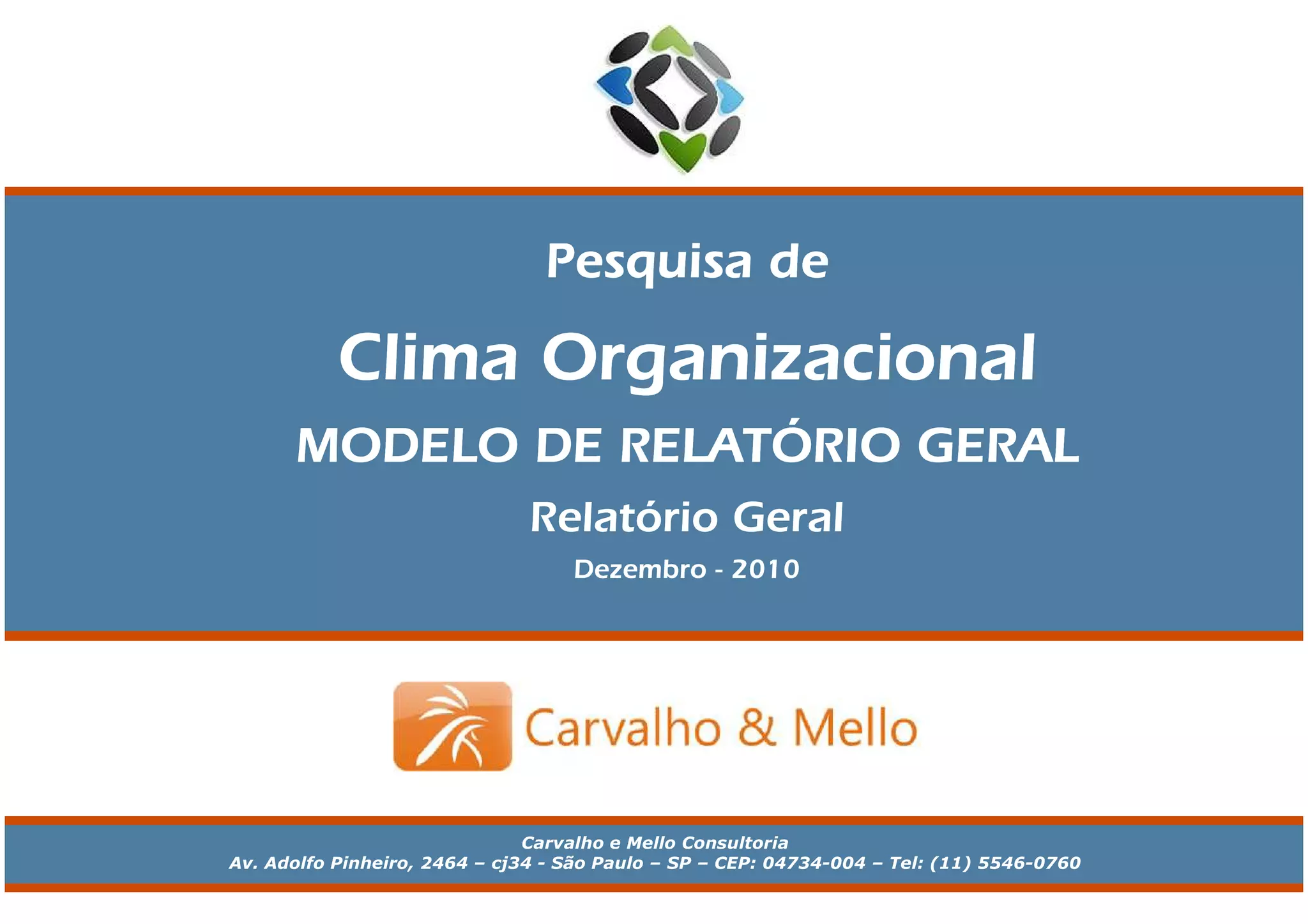 O documento apresenta os resultados de uma pesquisa de clima organizacional realizada em uma empresa. A pesquisa avaliou diversos atributos relacionados ao núcleo/setor da empresa, à liderança, ao movimento comunitário da empresa e à satisfação geral dos funcionários. Os resultados indicam áreas com altos e baixos níveis de favorabilidade entre os funcionários. O relatório fornece detalhes sobre a metodologia da pesquisa, perfis dos respondentes e os resultados de cada atributo e bloco avaliado.