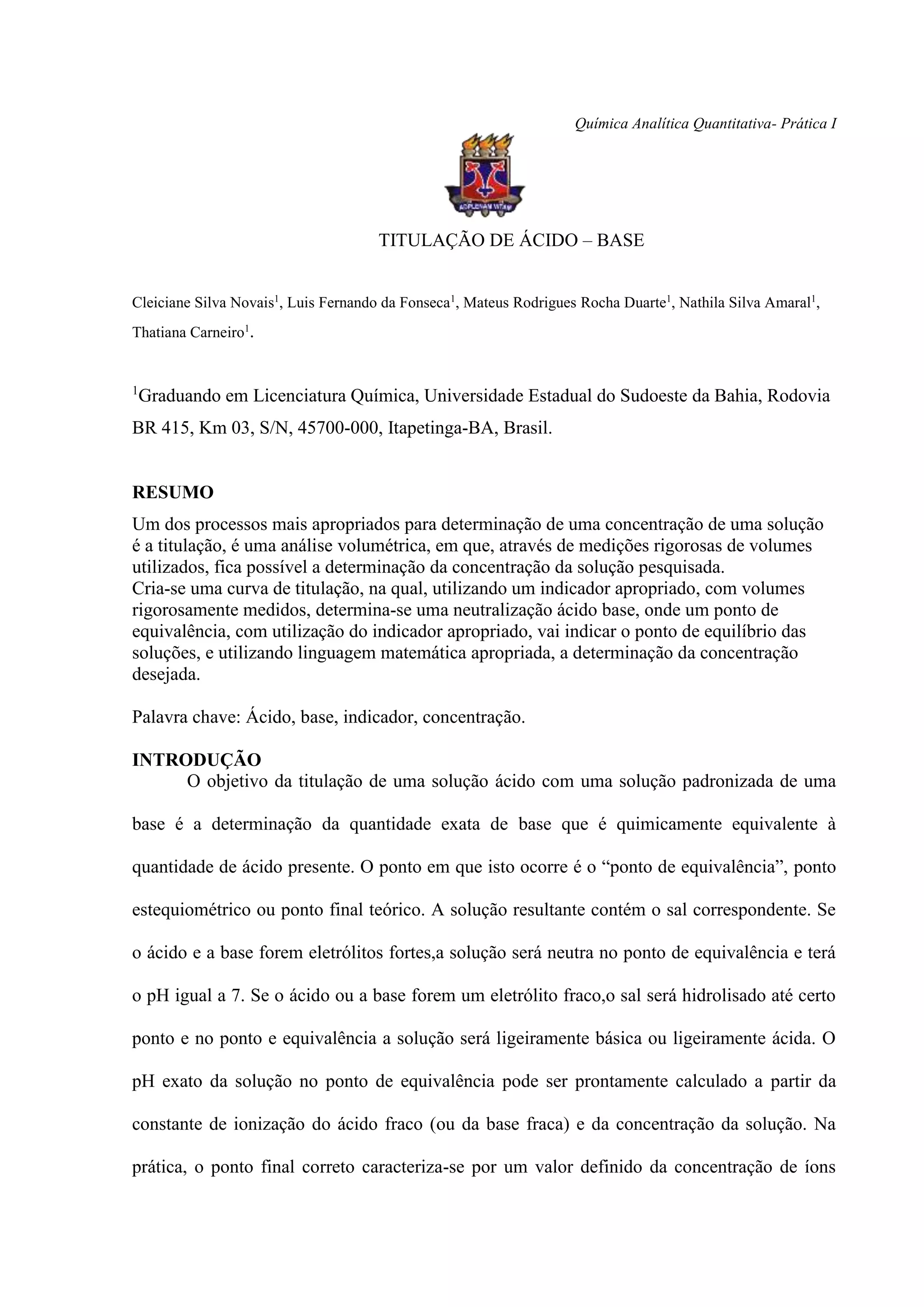 O documento descreve um experimento de titulação ácido-base realizado por estudantes de química para determinar a concentração de uma solução de HCl. Os estudantes titularam a solução de HCl com soluções de NaOH de concentrações conhecidas e calcularam a concentração de HCl usando os volumes de NaOH adicionados. Os cálculos mostraram que a concentração de HCl era próxima de 1 mol/L com um erro relativo de aproximadamente 80-83 ppm.