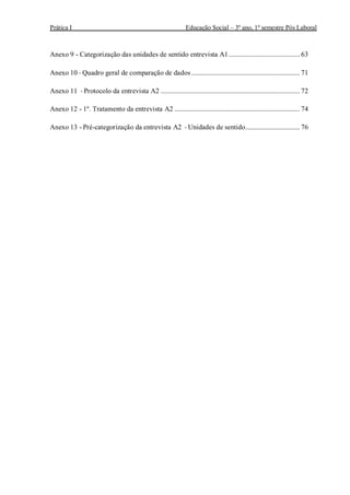 O documento apresenta o diagnóstico e projeto de educação social para a Junta de Freguesia de Almodôvar. Inclui uma introdução, metodologia, diagnóstico da área que analisa o enquadramento sociogeográfico, história e objetivos da instituição. Apresenta também o projeto "Lado a Lado" com os seus objetivos, atividades planeadas e método de avaliação.