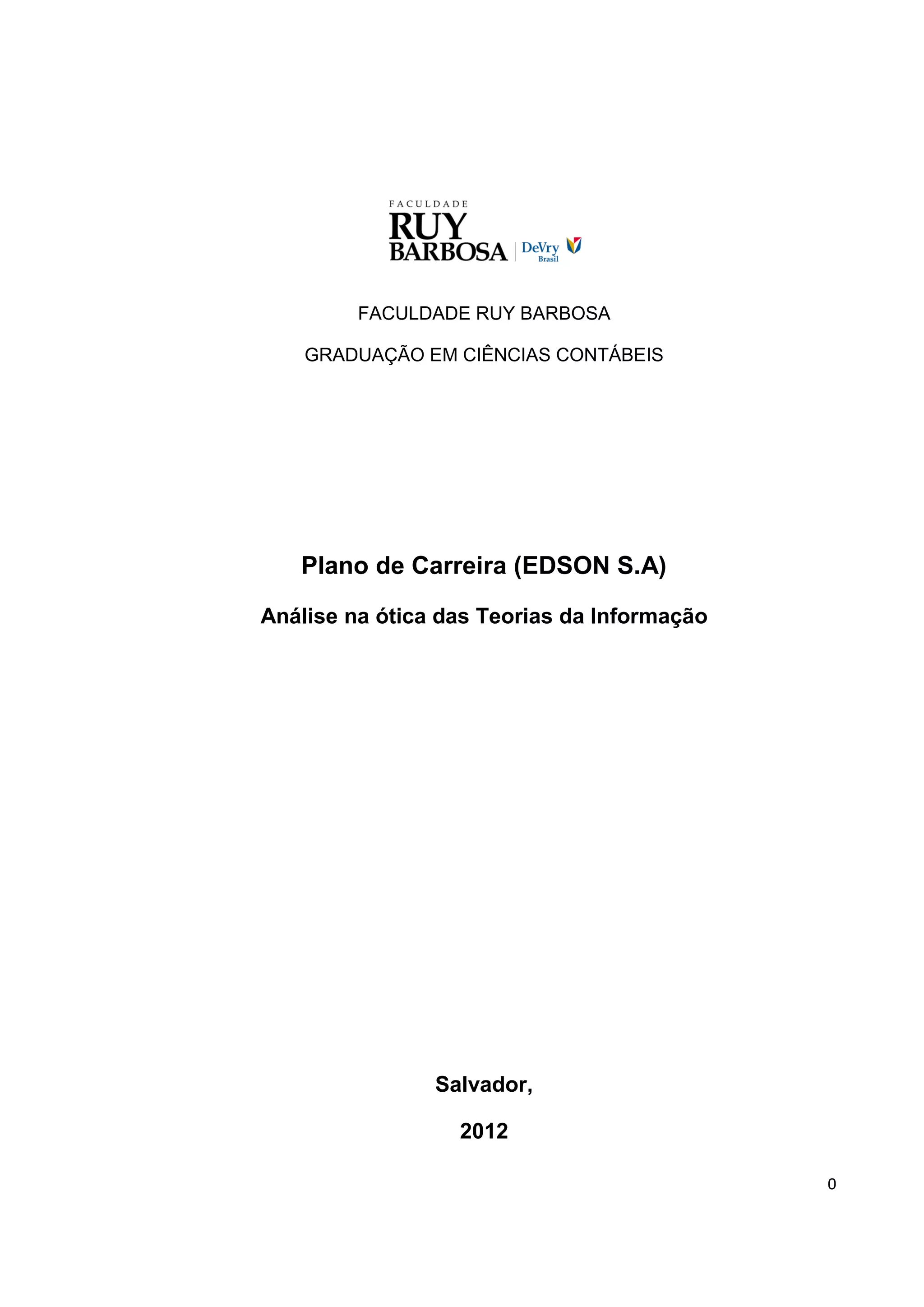 Este trabalho apresenta o plano de carreira do contabilista Edson dos Santos Sueira, descrevendo como ele se vê profissionalmente hoje, sua visão para o futuro e os valores e normas que o guiam. O documento também identifica seus principais "acionistas", como família e faculdade, e traça metas para seu desenvolvimento profissional.