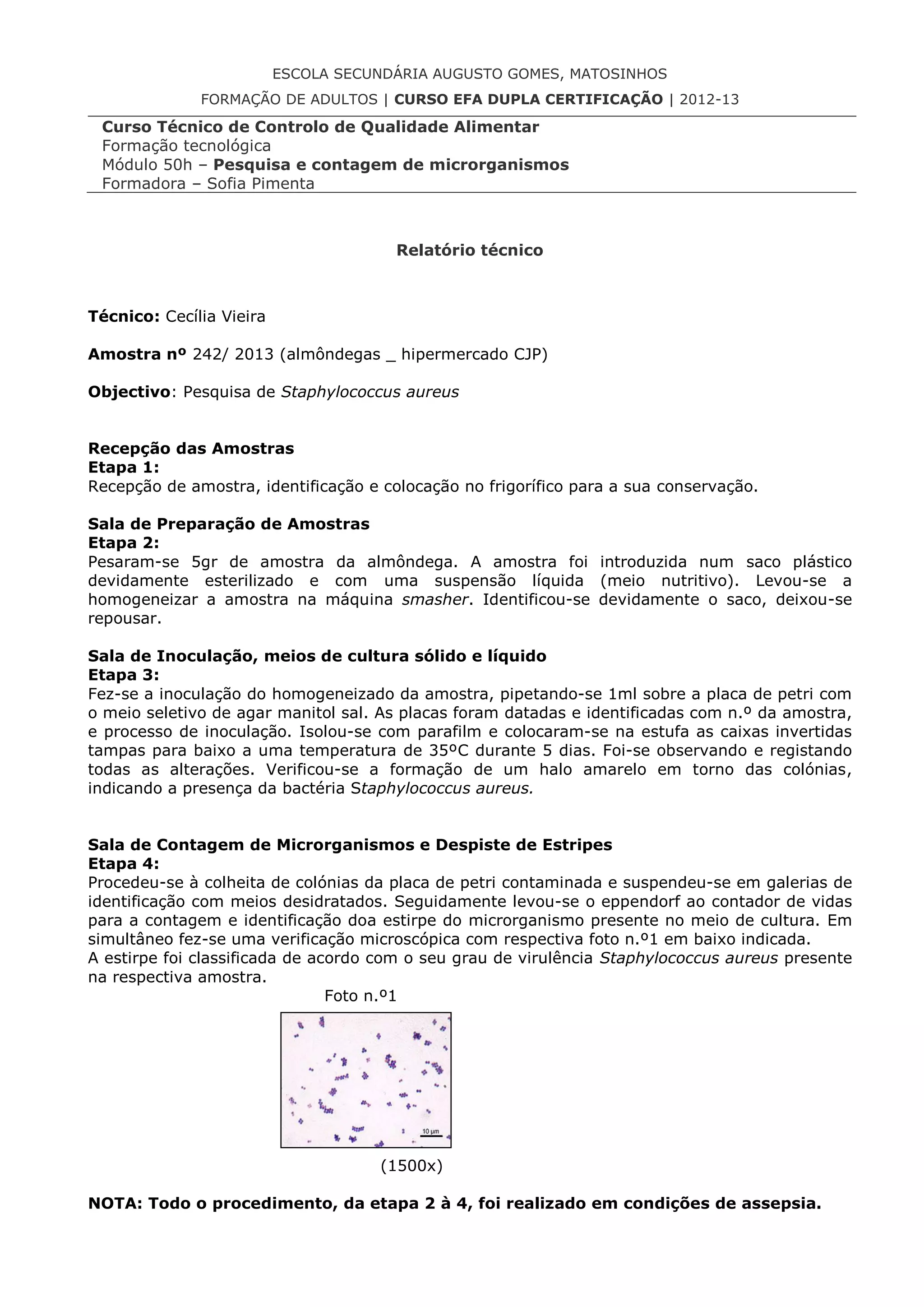 Uma técnica realizou testes de laboratório em uma amostra de almôndegas de um hipermercado para verificar a presença de Staphylococcus aureus. Após várias etapas que incluíram a preparação da amostra, cultivo em placas de Petri e contagem de colônias, a técnica confirmou a presença da bactéria. Um relatório técnico foi enviado ao cliente alertando sobre os riscos à saúde pública e recomendando a suspensão do produto.