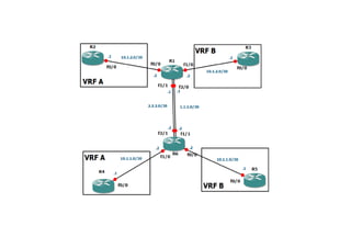 Este relatório descreve a implementação de duas Virtual Routing and Forwarding (VRFs) em uma rede usando o software GNS3. Os roteadores centrais interconectam as duas VRFs e roteiam tráfego entre elas, enquanto os roteadores nas VRFs mantêm a separação de tráfego.