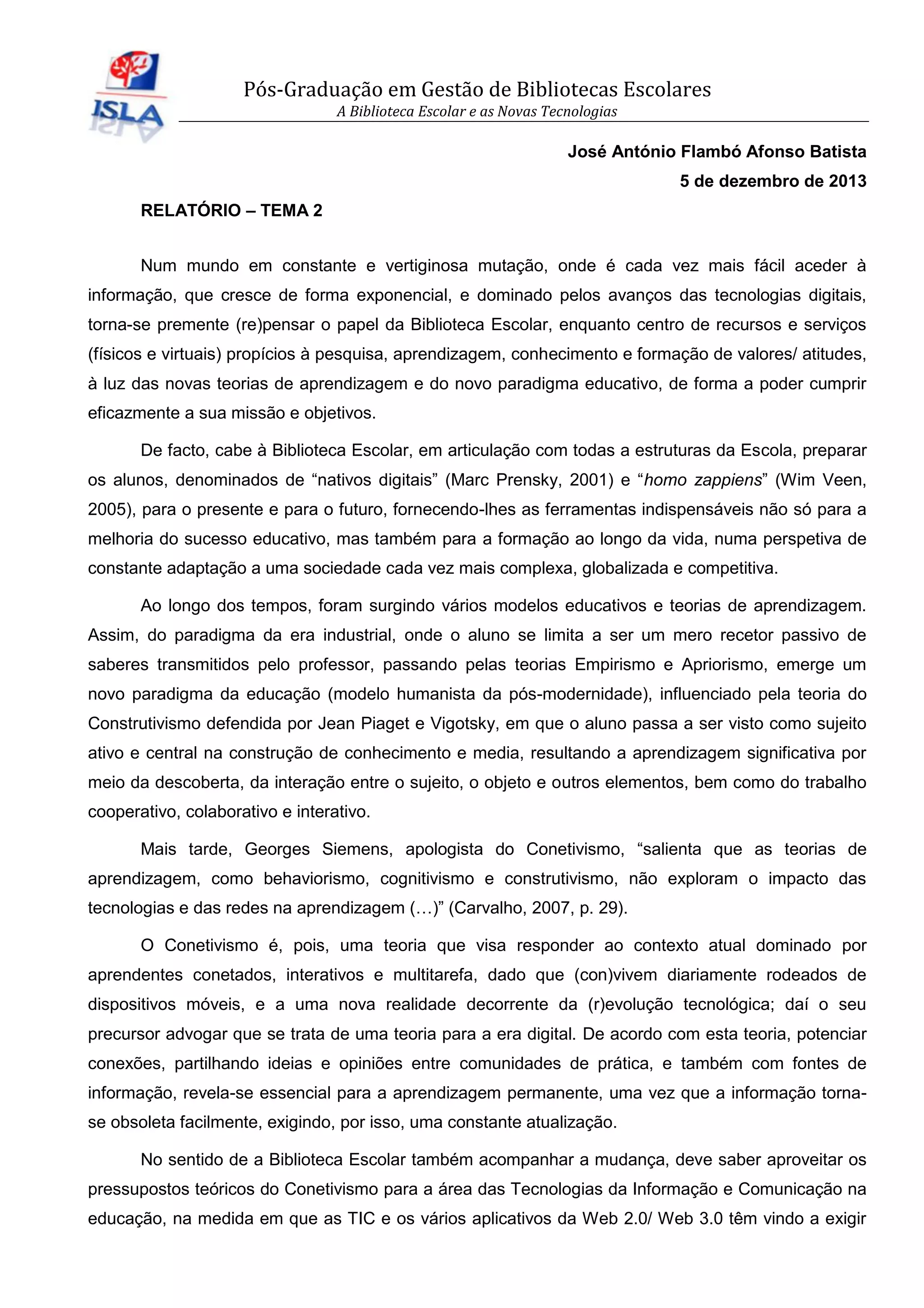 O documento discute o papel das bibliotecas escolares à luz das novas tecnologias e teorias de aprendizagem, argumentando que as bibliotecas devem integrar as tecnologias digitais para preparar os alunos para o presente e futuro, aproveitando as vantagens do conetivismo.