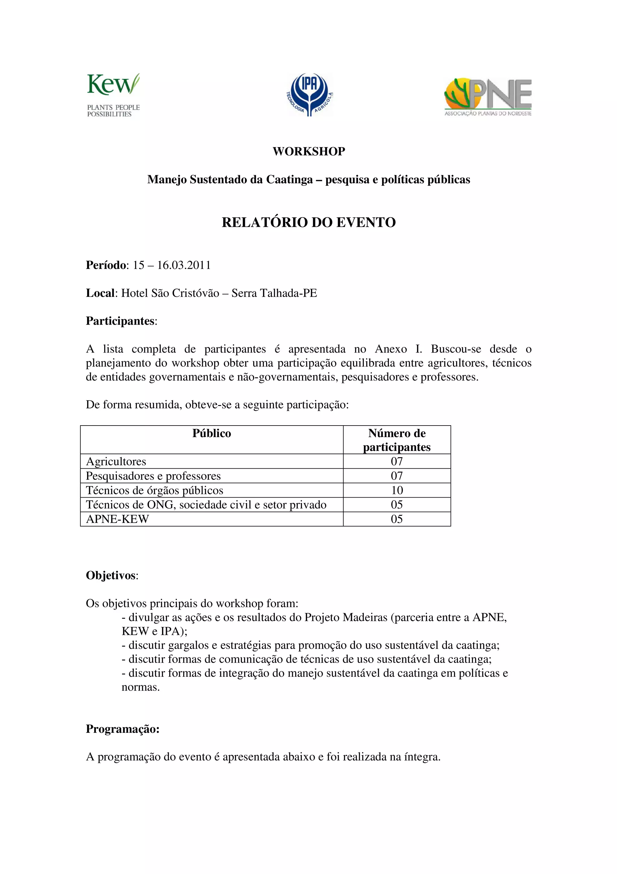 O documento relata sobre um workshop sobre manejo sustentável da caatinga realizado em Serra Talhada, PE. [1] O workshop reuniu agricultores, pesquisadores, técnicos de órgãos públicos e ONGs para [2] discutir experiências e estratégias para promover o uso sustentável da caatinga. [3] Os participantes debateram formas de comunicar técnicas de manejo e integrá-las em políticas públicas.