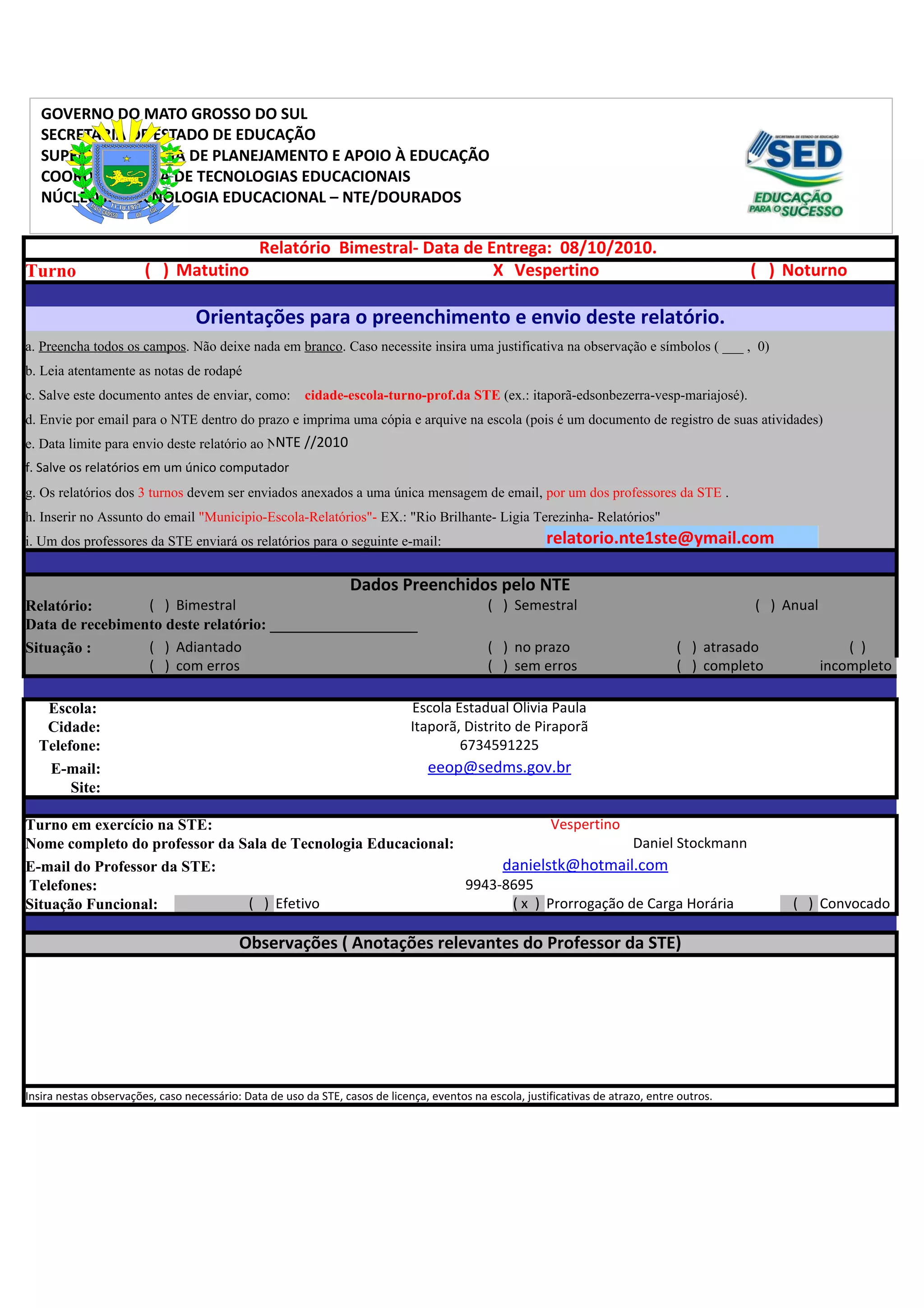 Este relatório bimestral fornece informações sobre o uso da Sala de Tecnologia Educacional na Escola Estadual Olivia Paula no turno vespertino, incluindo o número de alunos e professores que utilizaram a sala, os projetos e planos de aula realizados, e os professores responsáveis por cada disciplina.