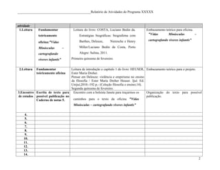 O relatório descreve as atividades desenvolvidas pela bolsista Luciana Alves Pinto no mês de fevereiro de 2012, que incluíram a leitura de dois livros para embasar teoricamente uma oficina planejada e um encontro com outra bolsista para organizar um texto sobre a oficina.