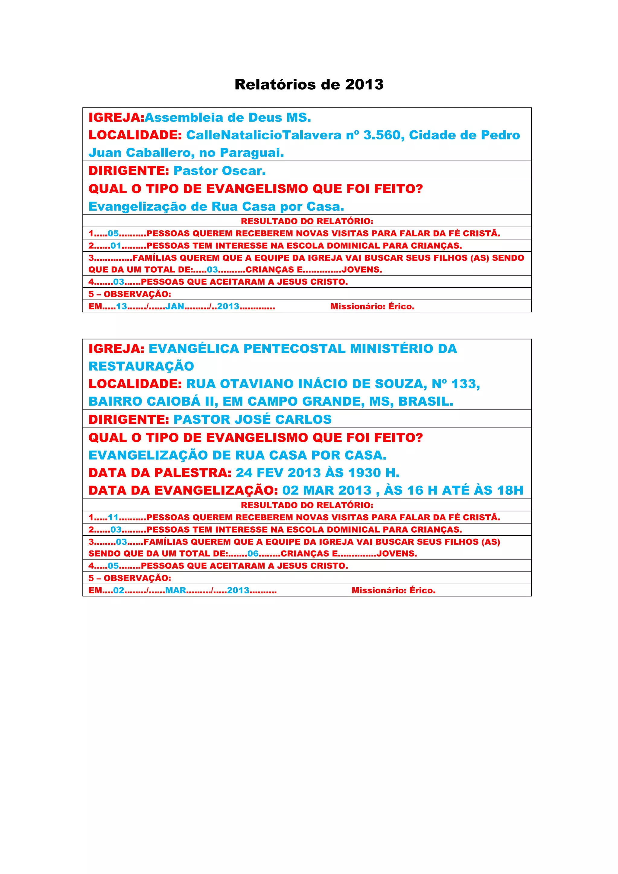 Dois relatórios de evangelismo realizados em 2013 pela Assembleia de Deus MS e pela Igreja Evangélica Pentecostal Ministério da Restauração descrevem os resultados de suas atividades de evangelização de rua e de casa em casa, incluindo o número de pessoas interessadas em receber mais visitas, interessadas na escola dominical e que aceitaram Jesus Cristo.