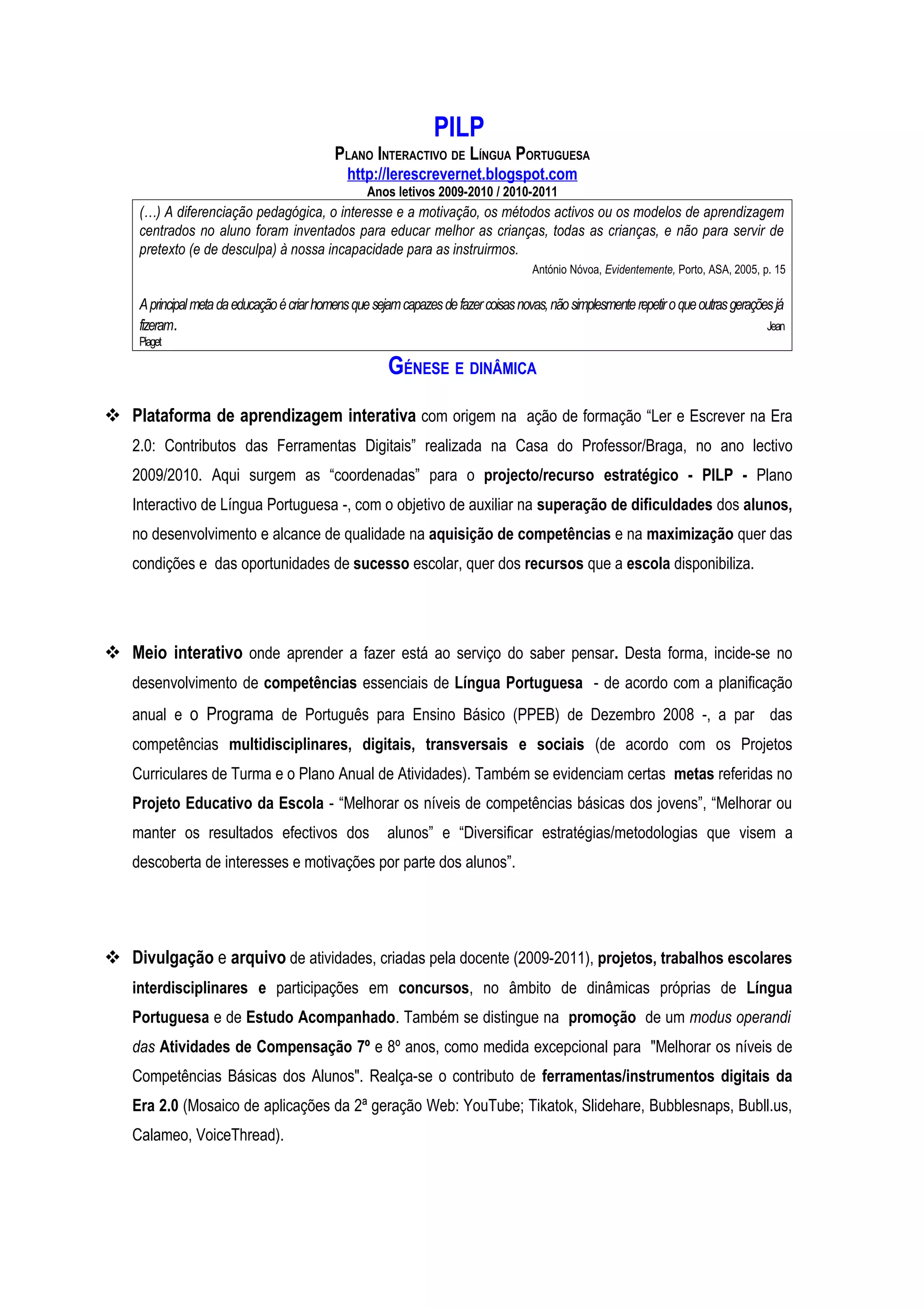 Este documento descreve um Plano Interativo de Língua Portuguesa (PILP) com o objetivo de auxiliar os alunos no desenvolvimento de competências linguísticas e no sucesso escolar através de atividades interativas. O PILP utiliza ferramentas digitais para promover aprendizagens colaborativas e personalizadas. Ele também serve como portfólio digital para arquivar trabalhos dos alunos.