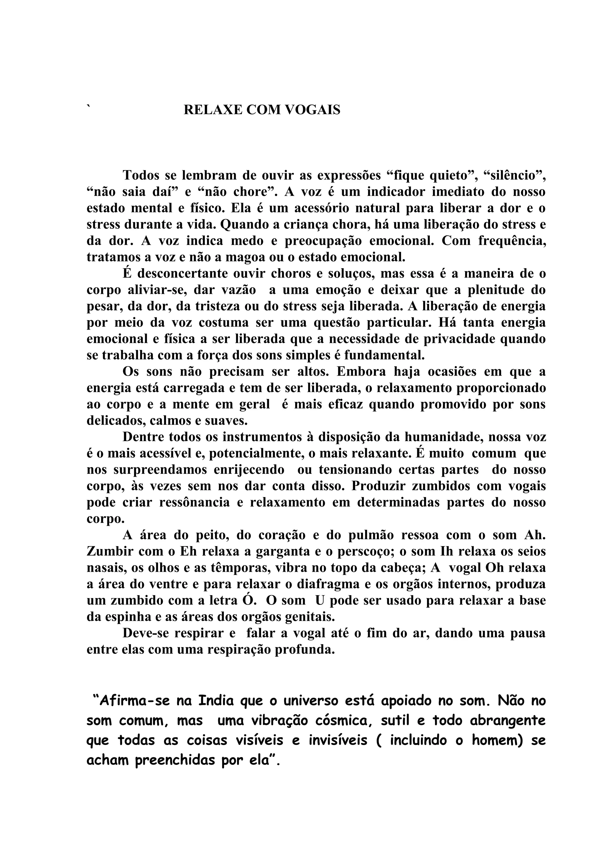 O documento discute como a voz é um indicador do estado mental e físico e como o choro é uma forma de liberar estresse e dor. Ele também descreve como produzir sons vocais simples com vogais pode ajudar a relaxar diferentes partes do corpo através da ressonância, como o som "Ah" relaxa o peito e o som "Ó" relaxa a área do ventre.