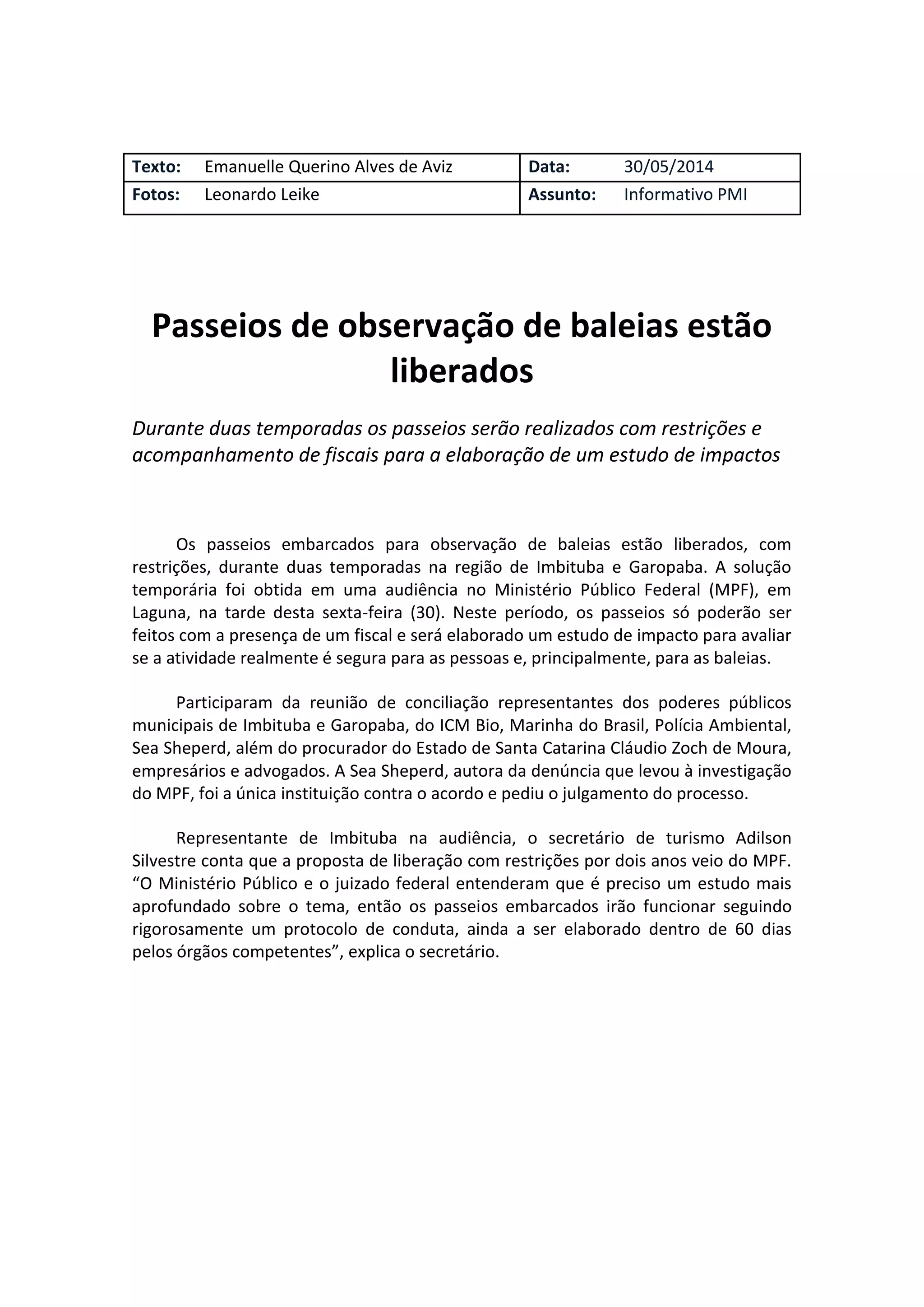 Os passeios de observação de baleias estão liberados por duas temporadas com restrições e acompanhamento de fiscais para a elaboração de um estudo de impacto. Os passeios só poderão ocorrer na presença de um fiscal e um protocolo de conduta será elaborado para garantir a segurança das pessoas e das baleias.