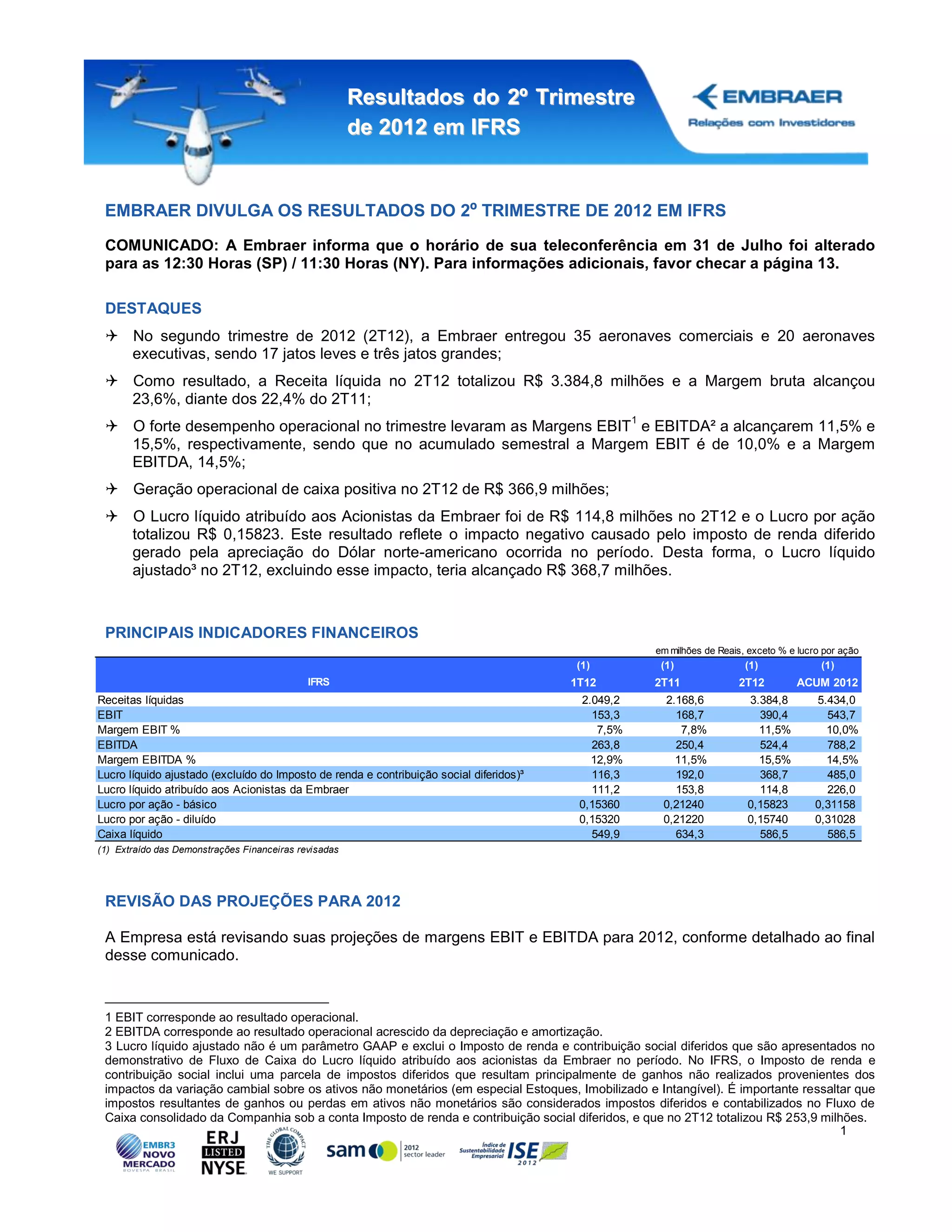 1) A Embraer entregou 35 aeronaves comerciais e 20 executivas no 2o trimestre, com receita líquida de R$3,4 bilhões e lucro líquido ajustado de R$368,7 milhões.
