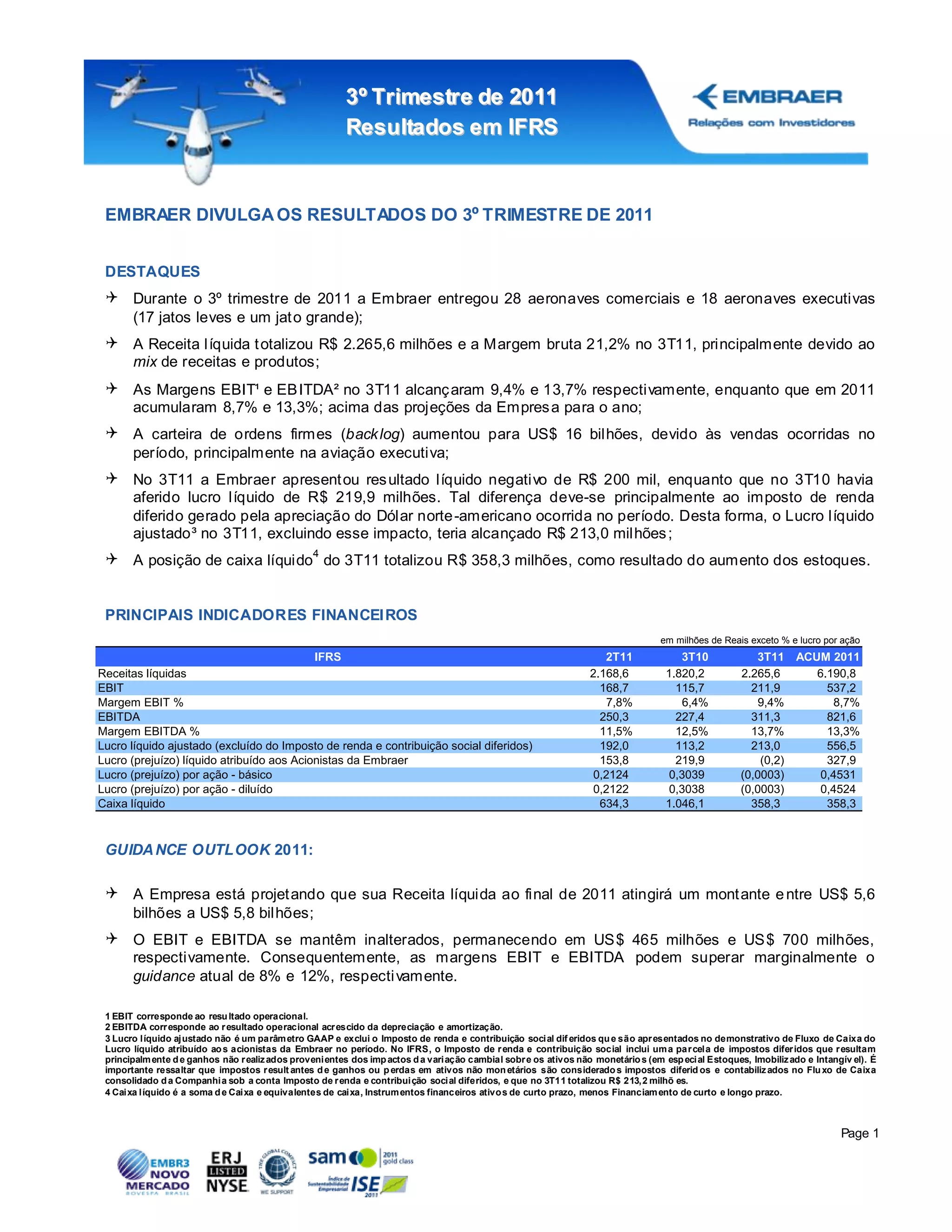 A Embraer divulgou seus resultados financeiros do 3o trimestre de 2011, com receita líquida de R$2,265 bilhões. Apesar da valorização do real, as margens EBIT e EBITDA atingiram 9,4% e 13,7% respectivamente. O lucro líquido foi de R$200 mil negativos, impactado pelo imposto de renda diferido devido à alta do dólar. A carteira de pedidos firmes aumentou para US$16 bilhões.