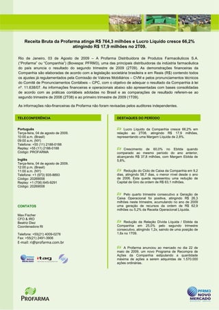 A Profarma atingiu R$ 764,3 milhões em receita bruta no 2T09, um aumento de 3,1% em relação ao ano anterior. Seu lucro líquido cresceu 66,2% para R$ 17,9 milhões no trimestre, com margem líquida de 2,8%. O EBITDA da empresa aumentou 60% para R$ 37,8 milhões no período, com margem EBITDA de 5,8%.