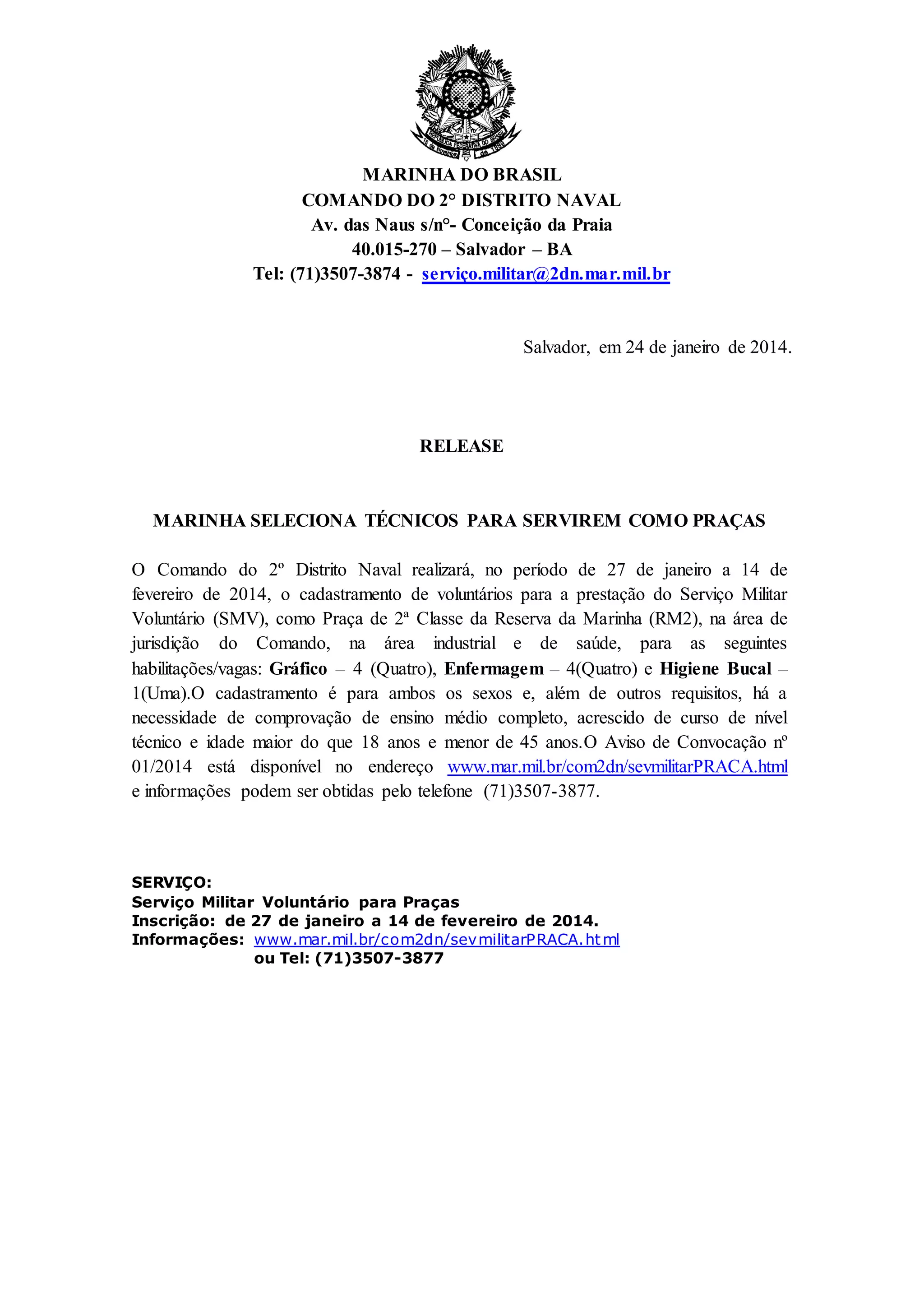 O Comando do 2o Distrito Naval da Marinha do Brasil está recrutando voluntários para o Serviço Militar Voluntário como Praças da Reserva da Marinha nas áreas de Gráfico, Enfermagem e Higiene Bucal. Os interessados devem ter ensino médio completo acrescido de curso técnico, idade entre 18 e 45 anos e se inscrever entre 27 de janeiro a 14 de fevereiro de 2014.