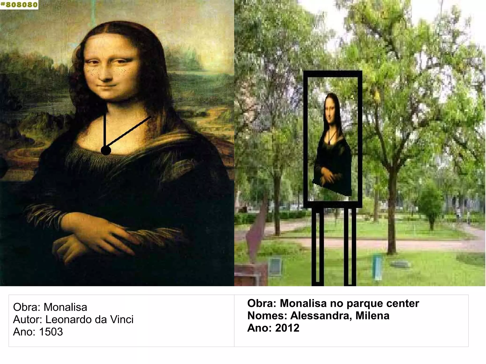 O documento lista várias obras relacionadas à Monalisa de Leonardo da Vinci, incluindo detalhes como nome do artista, nome da obra, e ano de criação. Há também menções a outras obras de arte e artistas como Van Gogh e obras inspiradas na Monalisa feitas por estudantes.