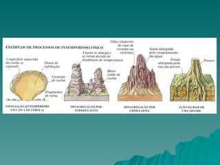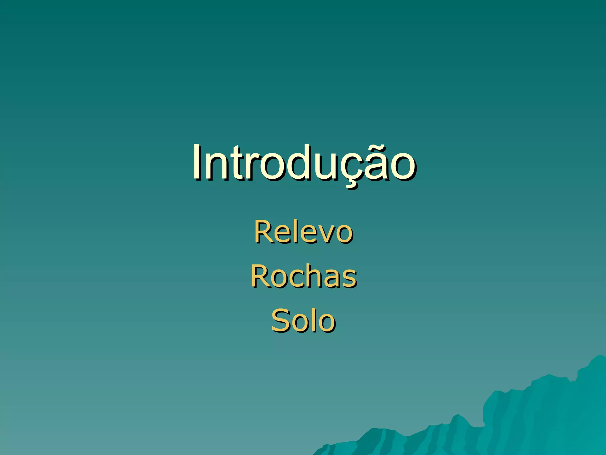O documento discute a formação do relevo terrestre, incluindo agentes internos e externos, tipos de rochas e processos de intemperismo e erosão. Fatores como tectonismo, vulcanismo e abalos sísmicos moldam o relevo, enquanto processos como erosão pluvial, fluvial, eólica e glacial modelam o relevo já estruturado. Rochas magmáticas, sedimentares e metamórficas compõem o relevo do Brasil, que inclui planícies, planaltos e