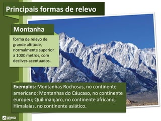 O documento descreve as principais formas de relevo da Terra: montanhas, planaltos, colinas, planícies, e vales, fornecendo exemplos de cada uma dessas formas em diferentes continentes.