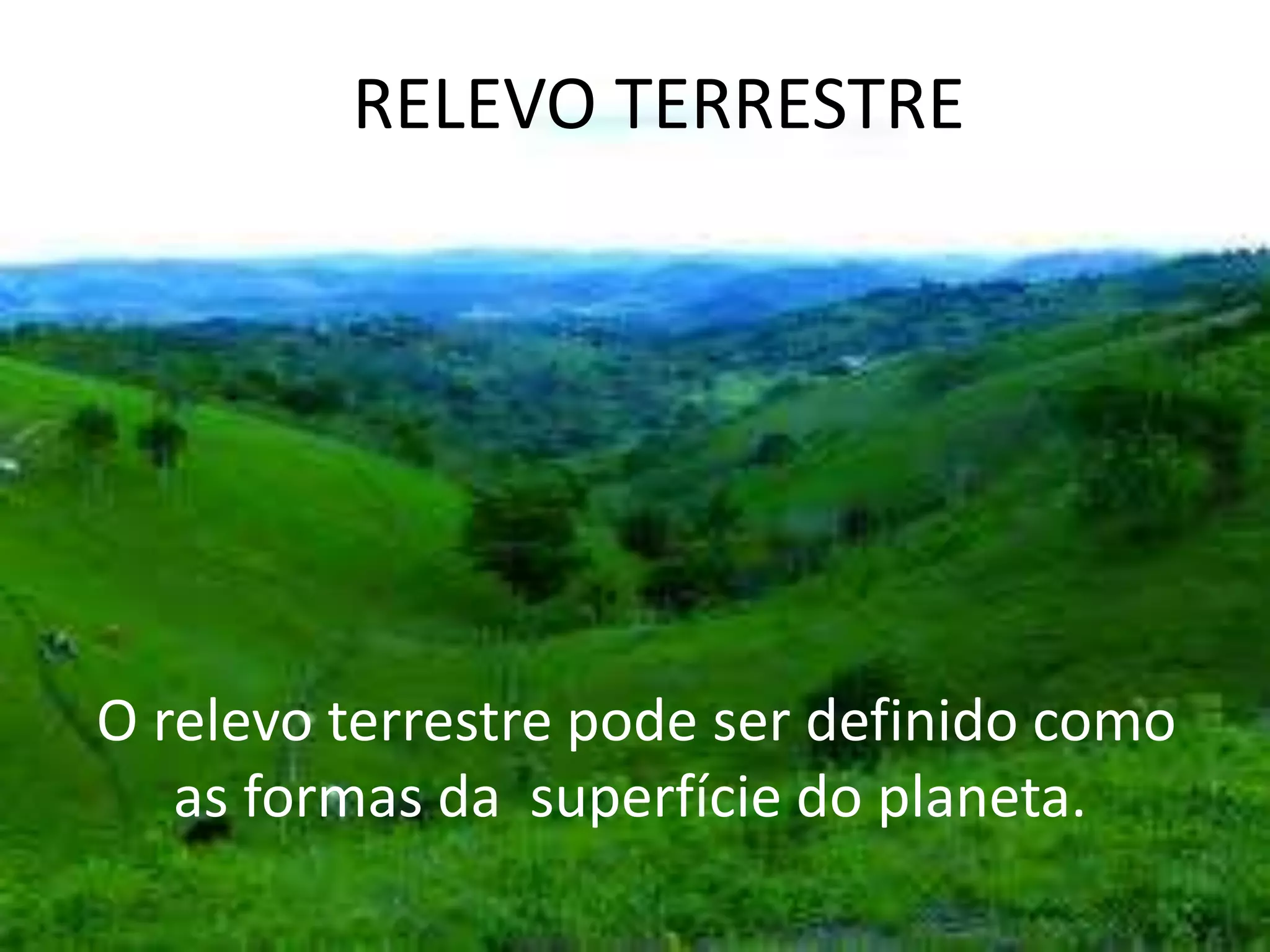 O documento descreve as principais formas do relevo terrestre, incluindo planícies (áreas planas), planaltos (superfícies elevadas niveladas), vales (áreas baixas entre montanhas), montes/morros (menores que montanhas), montanhas, depressões (áreas mais baixas), colinas (elevações arredondadas de baixa altitude), cordilheiras (conjuntos de montanhas), ilhas (terra cercada por água) e arquipélagos (conjuntos de ilhas).