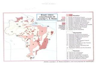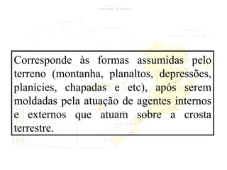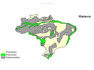 O documento descreve os principais tipos de relevo no Brasil, incluindo planaltos, planícies, depressões e montanhas. Planaltos são áreas acima de 200m do nível do mar, enquanto planícies são entre 0-200m. Planícies podem ser costeiras, continentais ou lacustres. Depressões são áreas abaixo do nível do mar ou dos relevos vizinhos. Montanhas são áreas de grande elevação resultantes do movimento das placas tectônicas.