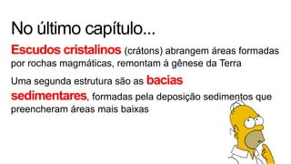 O documento descreve as principais características do relevo brasileiro, incluindo escudos cristalinos, bacias sedimentares, planaltos, planícies e depressões. O relevo foi classificado por Azevedo, Ab'Saber e Ross, levando em conta processos geomorfológicos e altimétricos. Exemplos notáveis de altitude no Brasil incluem Pico da Neblina, Pico 31 de Março e Pedra da Mina.
