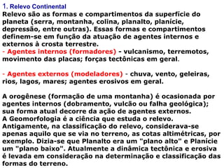 1 . Relevo Continental Relevo são as formas e compartimentos da superfície do planeta (serra, montanha, colina, planalto, planície, depressão, entre outras). Essas formas e compartimentos definem-se em função da atuação de agentes internos e externos à crosta terrestre. -  Agentes internos (formadores)   - vulcanismo, terremotos, movimento das placas; forças tectônicas em geral . -  Agentes externos (modeladores)  -  chuva, vento, geleiras, rios, lagos, mares; agentes erosivos em geral. A orogênese (formação de uma montanha) é ocasionada por agentes internos (dobramento, vulcão ou falha geológica); sua forma atual decorre da ação de agentes externos. A Geomorfologia é a ciência que estuda o relevo. Antigamente, na classificação do relevo, considerava-se apenas aquilo que se via no terreno, as cotas altimétricas, por exemplo. Dizia-se que Planalto era um "plano alto" e Planície um "plano baixo". Atualmente a dinâmica tectônica e erosiva é levada em consideração na determinação e classificação das formas do terreno.