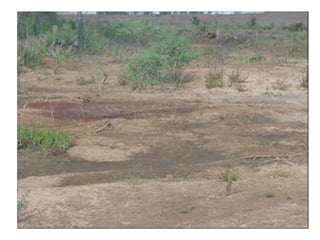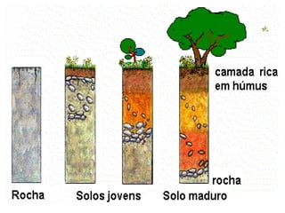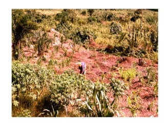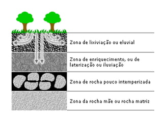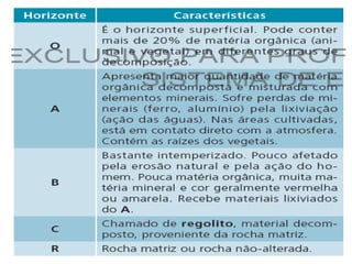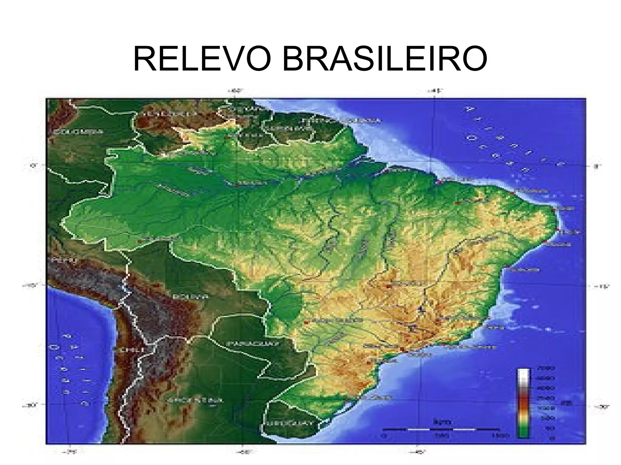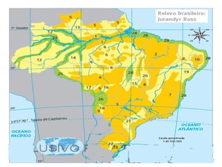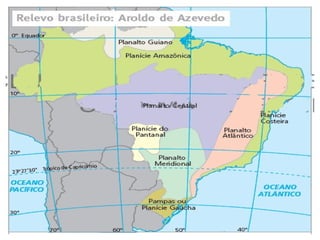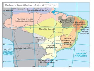 O documento descreve as principais classificações do relevo brasileiro ao longo das décadas de 1940 a 1980, introduzindo os conceitos de planaltos, planícies e depressões com base em altitude e processos erosivos e sedimentares. Também aborda brevemente os processos de degradação dos solos no Brasil, como a lixiviação, laterização e salinização.
