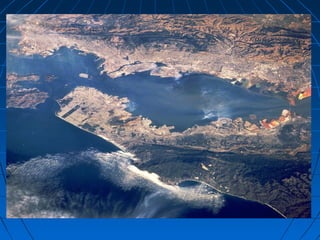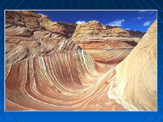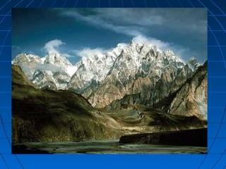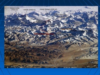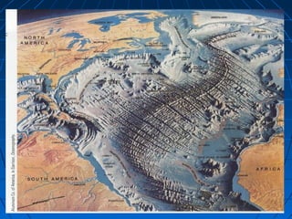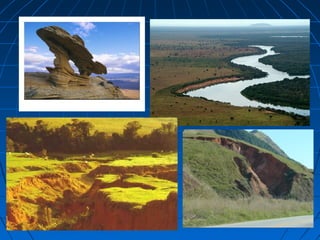 O documento discute os principais aspectos do relevo terrestre, incluindo os pontos mais altos como o Himalaia e os Andes, e os mais baixos como as Fossas Marianas, e os processos de erosão que moldam a paisagem, como a erosão marinha, fluvial, eólica e glacial.