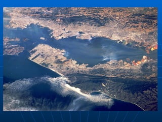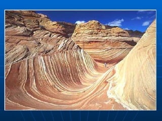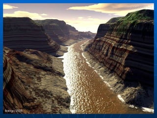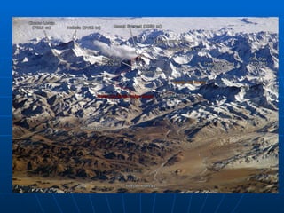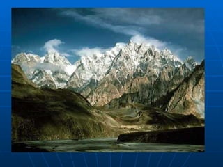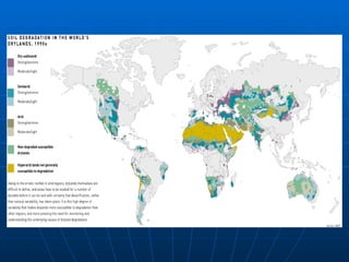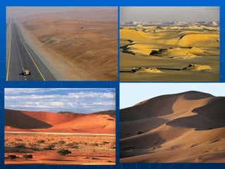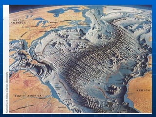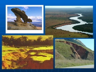 O documento discute as principais características do relevo terrestre, incluindo os pontos mais altos como o Himalaia e os Andes, locais abaixo do nível do mar como as Fossas Marianas, processos de erosão como a erosão marinha e fluvial, e desertos.