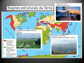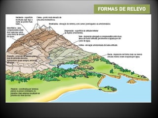 O documento descreve os principais conceitos de erosão, relevo e tipos de relevos terrestres. Fala sobre a erosão como o desgaste da superfície terrestre e lista exemplos de relevos como serras, planaltos, planícies e montanhas de diferentes locais do mundo.