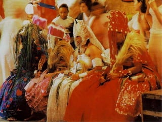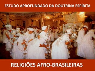 O documento analisa a doutrina espírita e as religiões afro-brasileiras, ressaltando que estas últimas englobam cultos de diversos povos africanos trazidos ao Brasil. Enfatiza a importância dos orixás e a singularidade do candomblé, que é centrado em práticas rituais e na consulta ao oráculo, diferenciando-se da umbanda. O candomblé é visto como uma religião monoteísta que preserva a herança cultural africana, apesar da sua criminalização histórica.