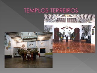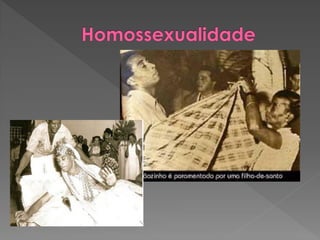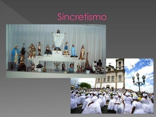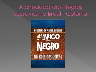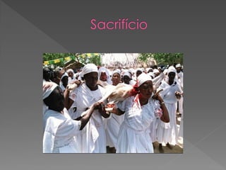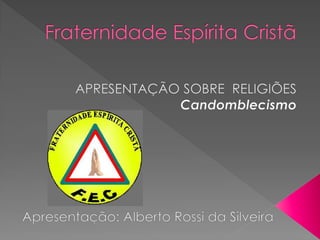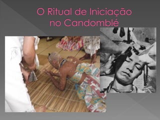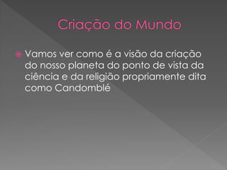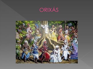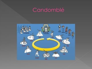O documento discute a origem e crenças do Candomblé, incluindo: 1) Sua origem na África e como foi trazido para o Brasil por escravos; 2) As principais nações dentro do Candomblé e os Orixás cultuados; 3) Os 12 Orixás mais cultuados e suas características.